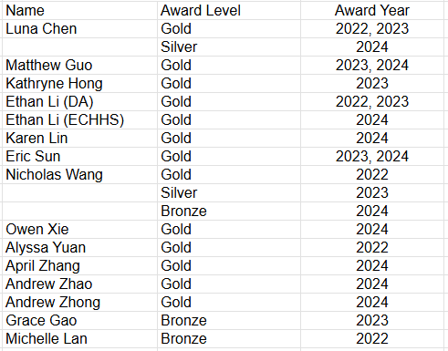 Kai Hui Grace Koh, Carolyn Shi, Peiran Song, Tian Zi Wang, Jiarong Wei, Weixu Wen, Christina Xie, Selina Xie, Immaculate Wanjiku, Audrey Biller, Fallon Kichman-Heath, Neha Madhavapeddi, Joy Schwartz, Audrey Ashdown, Katherine Young, Paul Lindner, Richard Li, Kevin Chen, Matthew Lee, Carolyn shi, Christopher Wu, Bohan Gao, Zihan Guo, Sven Li, Aneesh Patkar, Eric Wan, Andy Yi, Joshua Yoon, Joanna Yoon, Alice Cheng, Matthew Sun, Rithika Bandaru, Zian Chen, Alan Gao, Kathryne Hong, Kevin Hu, Thomas Jiaqi Jin, Stella Kim, Michelle Lan, Kevin Lu, Andrew Xu, Alyssa Yuan, Luna Chen, Ethan_DA Li, Siwei (Wesley) Li, Vanessa Lin, George Wang, Nicholas Wang, Jack (Zhiyuan) Xu, Yue (Elsa) Xu, Matthew Guo, Yichen Zhao, Kevin Jiang, Andrew Zhong, Joann Wang, Selena Wang, Kathy Li