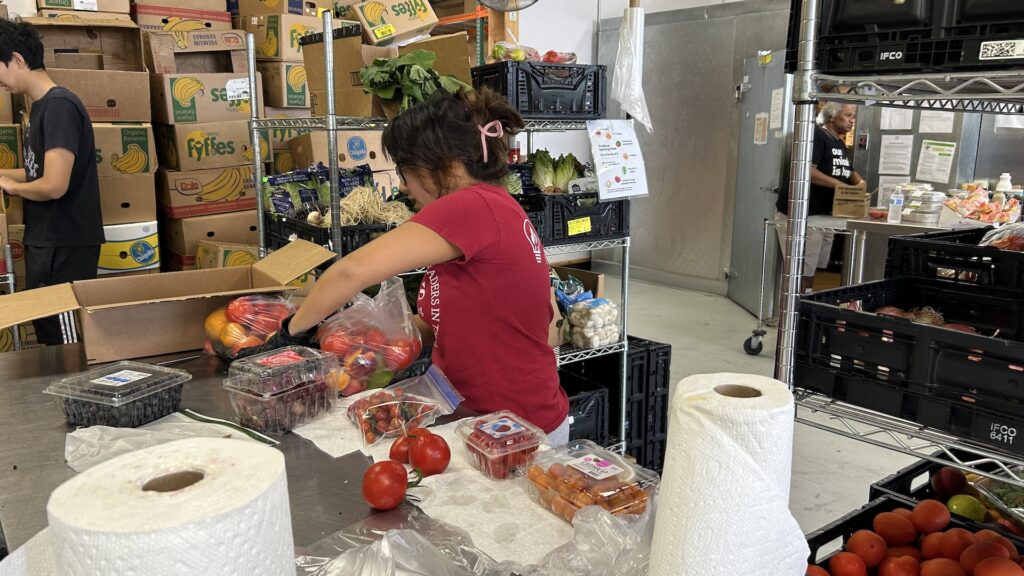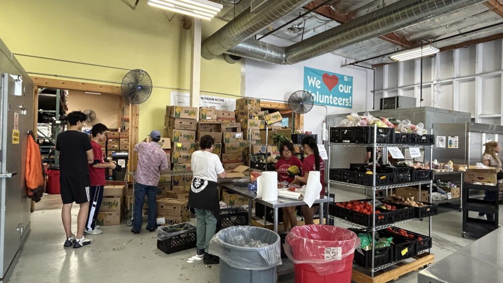 Members signed in at the front desk before making their way to their separate stations. Some members worked at the produce area, and others worked in the food box area. At the produce area, they carefully hand-picked all the fresh fruits and veggies and discarded the moldy/rotten ones into the farm box for the animals. Then, they took a bag and filled it up with an assortment of veggies/fruits for them to be later put into the food boxes. Members repeated this process over and over until the end. At the food-box making section, members filled each food box with bags of vegetables, a bag of fresh produce, 3 breads, and 2 kinds of desserts. Members repeated this process until the food bank was closed. Then, they helped clean up by wiping down the floors and spraying down the tables.