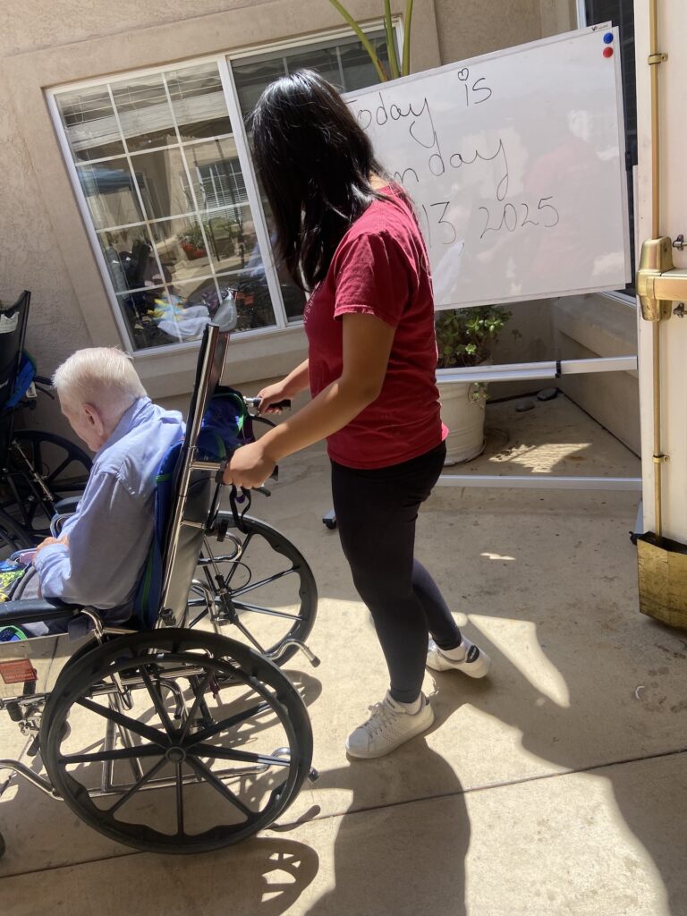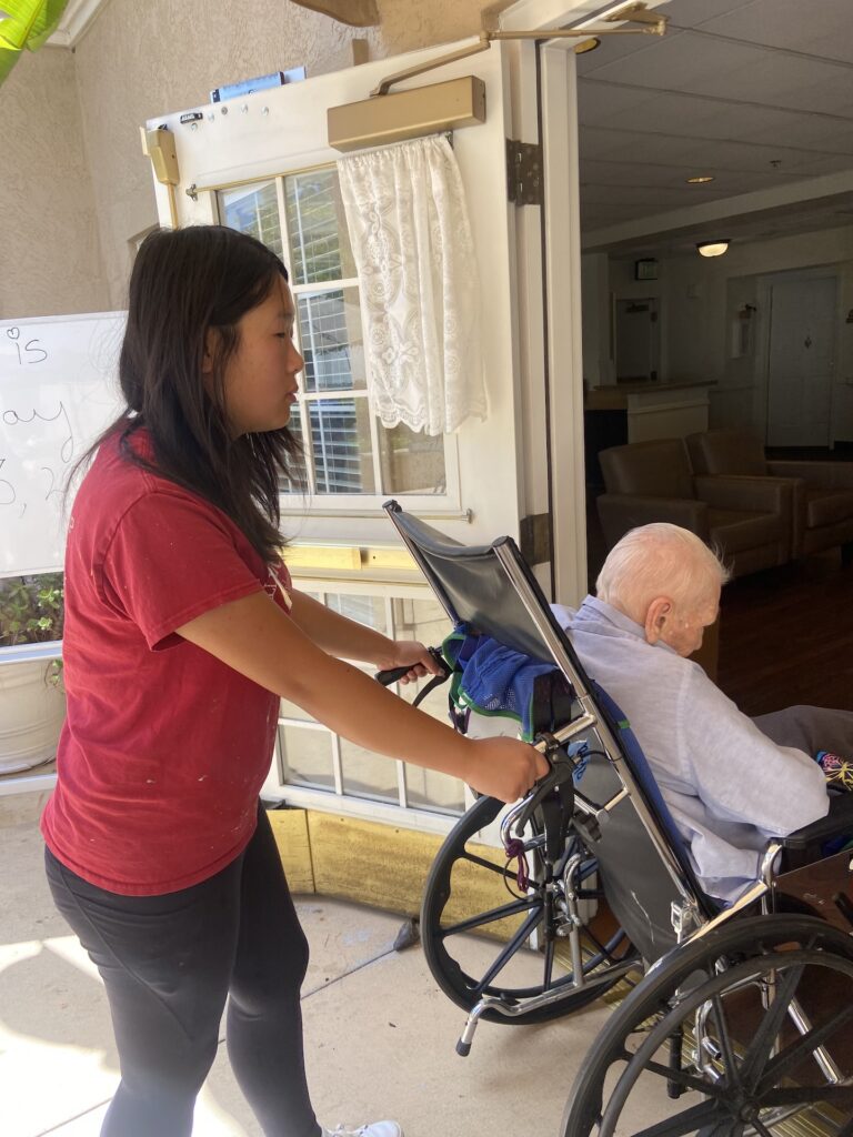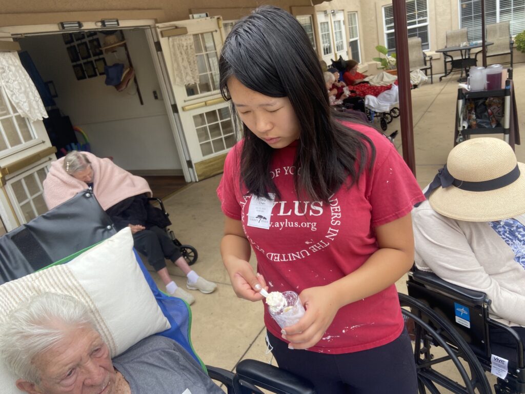 On July 13th, 2025, Murrieta AYLUS members volunteered at their local senior center. First, the volunteers started on making a fruit snack with cottage cheese which could be served to all the residents. Since many of the residents couldn’t feed themselves, the volunteers also fed them the fruit snack. After they had all finished with their snack, the volunteers started serving a round of water and juice, taking into account any residents with special dietary or mechanical needs such as diabetes or needing thickened juice. Afterwards, some of the female residents were treated to a nail spa where they got to enjoy a nice nail soak and a choice of nail polish color. Finally, the residents were led to the dining room for lunch.