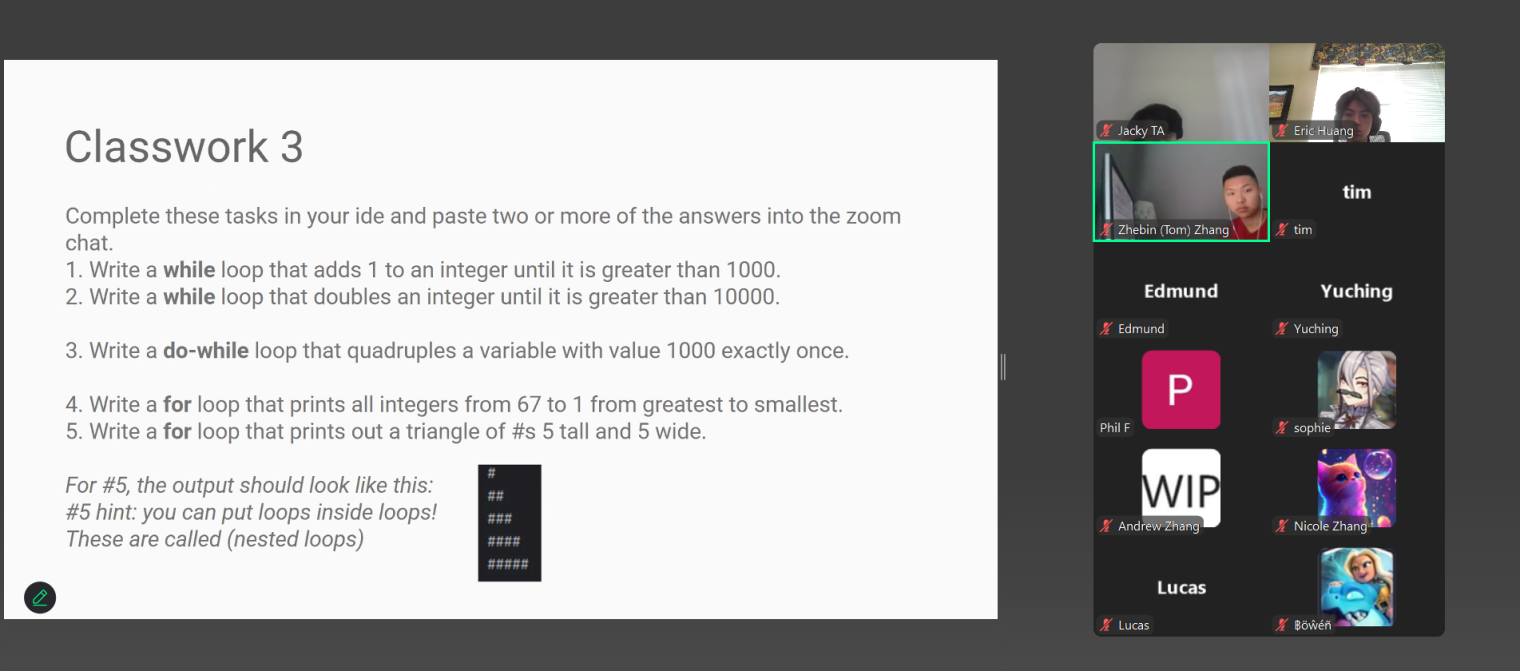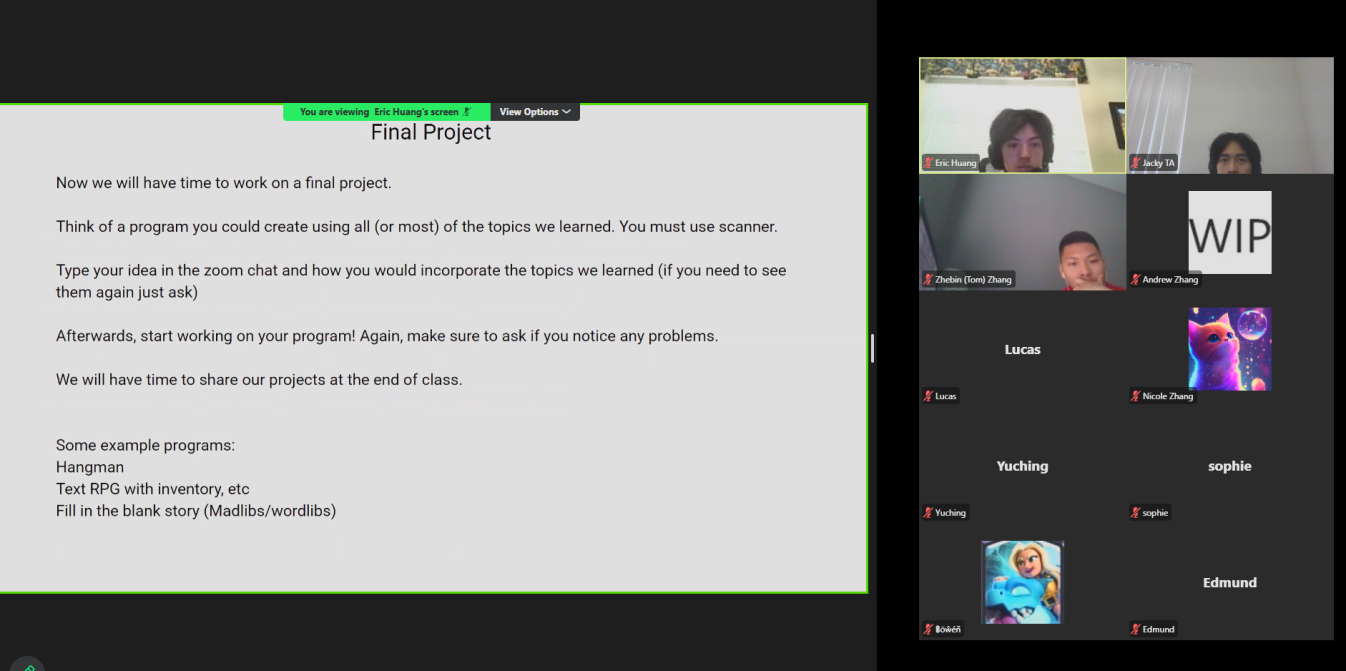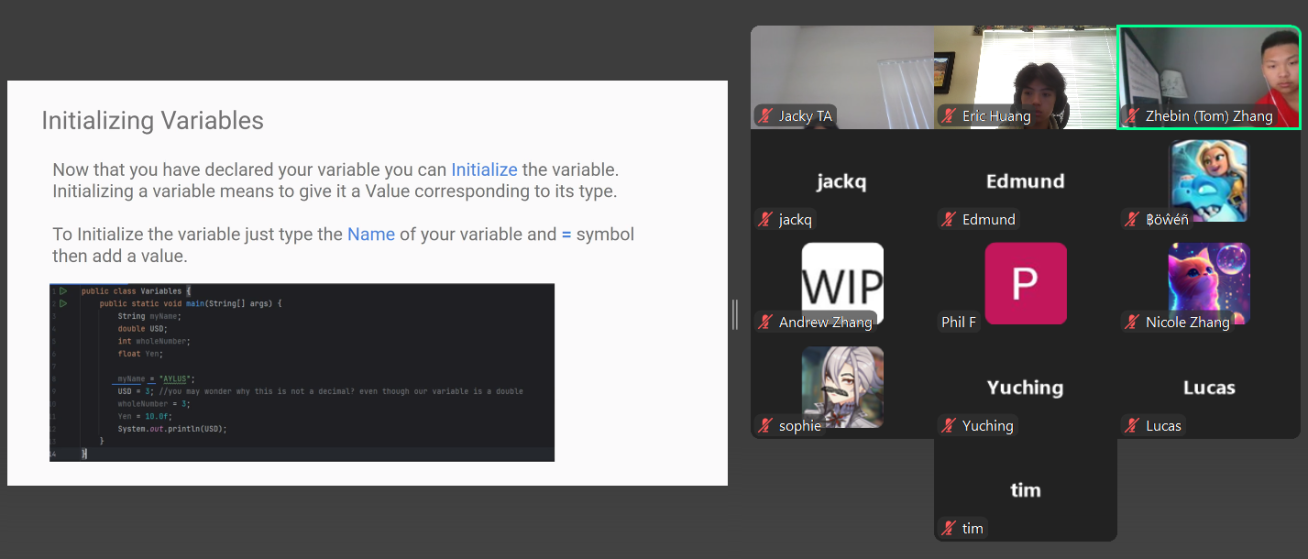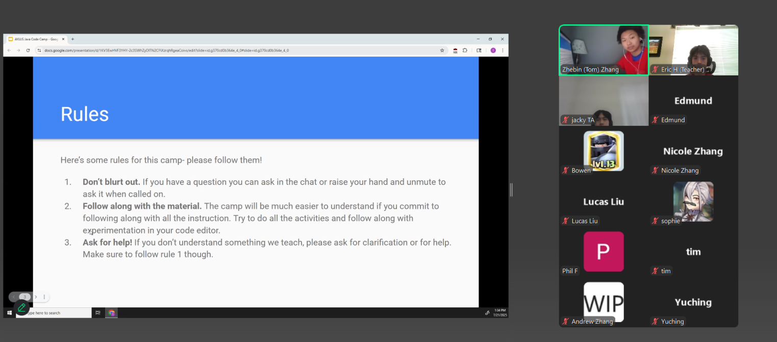 The AYLUS Lake Washington Branch successfully hosted a five-day Beginner Java Camp from July 21 to July 25, 2025. Led by teachers Eric Huang, Zhebin Zhang, and Jacky Wenjie Yan, the camp offered students a strong foundation in Java programming. Sessions were started daily at 1:30 PM, the regular lectures lasted for two hours. In addition to the regular lecture, Eric and Zhebin provided homework support, answered student questions, and dedicated time to reviewing and correcting assignments.