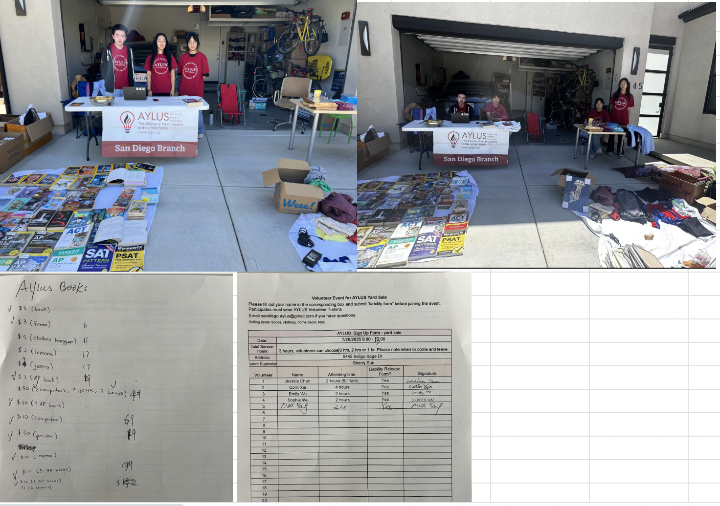 On July 26th, 2025, the AYLUS San Diego Branch successfully organized its second community yard sale. Members donated a wide variety of items—including books and magazines, toys, paintings, bags, clothing, and more—which were offered at affordable prices to local shoppers.