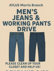 On August 2 at 2:00 p.m., members of the AYLUS Morris Branch partnered with the nonprofit organization Help4All to deliver a significant contribution to their community: 93 pairs of men’s work pants. The effort began weeks earlier, when members identified a growing need for durable clothing to support individuals entering or rejoining the workforce. Recognizing that many people lack access to basic essentials, the branch developed a plan to collect work pants by setting up donation sites throughout the local area.