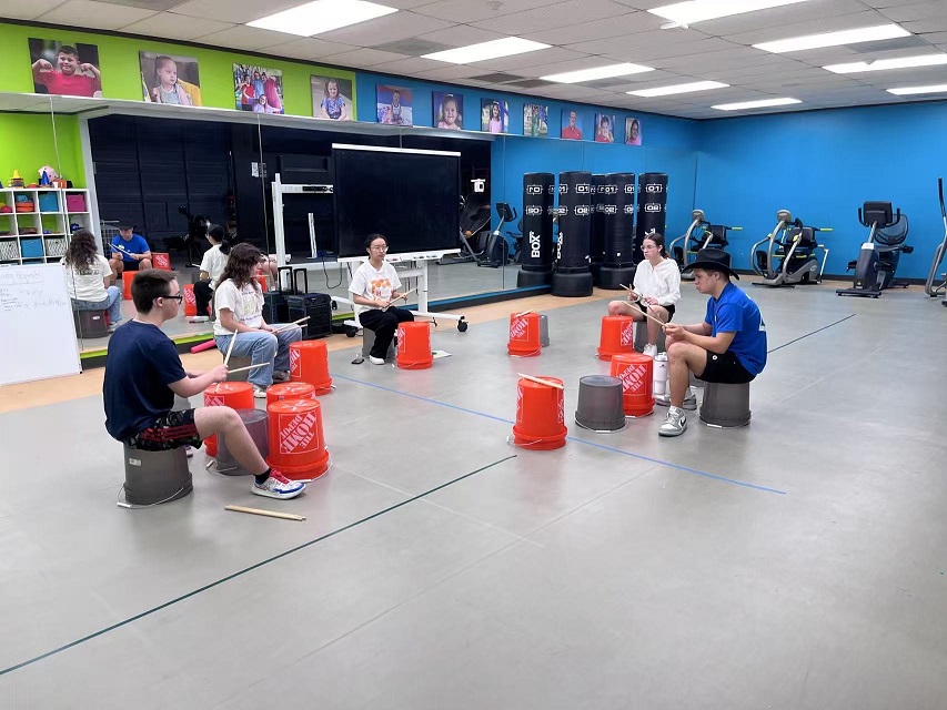 On July 31, volunteers taught the final bucket drumming class of the summer at GiGi’s Playhouse Sugar Land. They reviewed the skills learned over the previous sessions and led participants in practicing and performing a full song using bucket drums.
