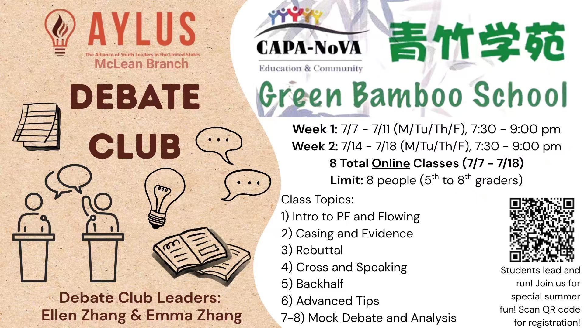 Virtual Summer PF Debate Camp—(July 7th- July 18th)Public forum debate is great for the community as a way to educate people on current events and provide them a platform to discuss their ideas. Individually, it helps young people develop essential life skills like communication, teamwork, and critical thinking, while providing an extracurricular for them to enjoy.