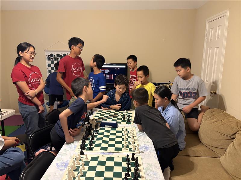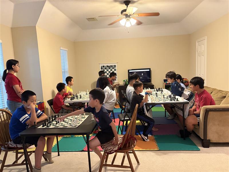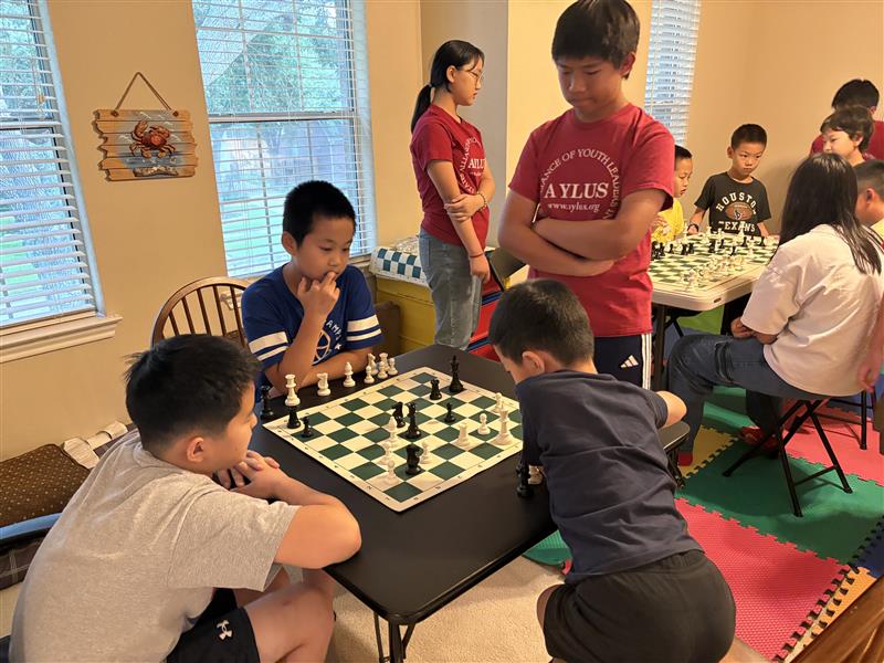 On Sunday August 3, 2025, Joshua Meng, Brendon Jiang, and Alicia Zhang hosted the Pearland Branch volunteer chess lesson. The students were introduced to what it means to play in a chess tournament. They learned things that they shouldn’t do, such as talking, and things they should do such as taking their time before making a decision.They attempted to use strategies taught in previous lessons and implement them into games against peers.