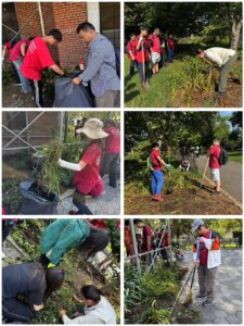 The garden bed area was alongside the park hub, with around ten beds surrounding the building. Following Roxana’s instructions, our groups went to their designated beds and began their assignments. Each group used shovels and gloves to clear out the beds by removing unwanted plants and weeds. It was important that our members kept the loose soil within the beds and away from the path. Additionally, some of our younger members were tasked with either cutting off overgrown branches from bushes using loppers or raking piles of dead leaves and plants. Each garden bed also had members stationed to hold trash bags and collect the gathered plant waste.