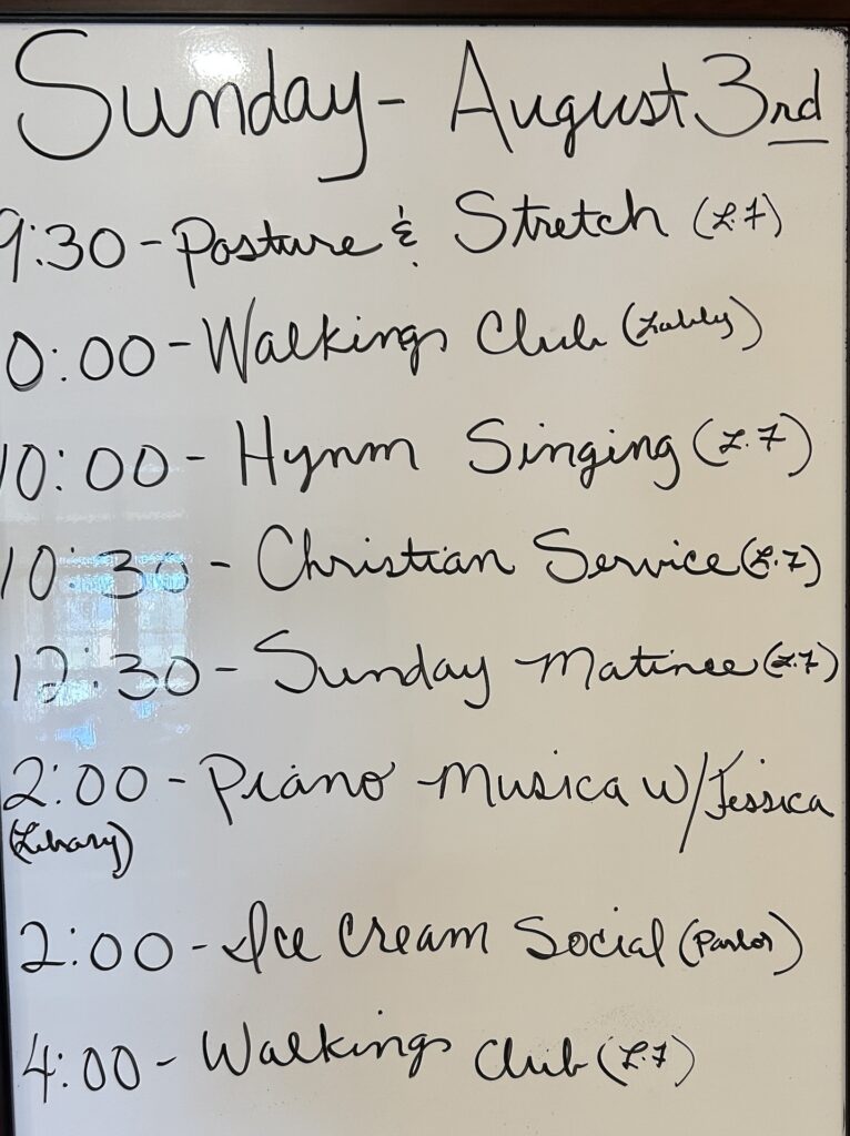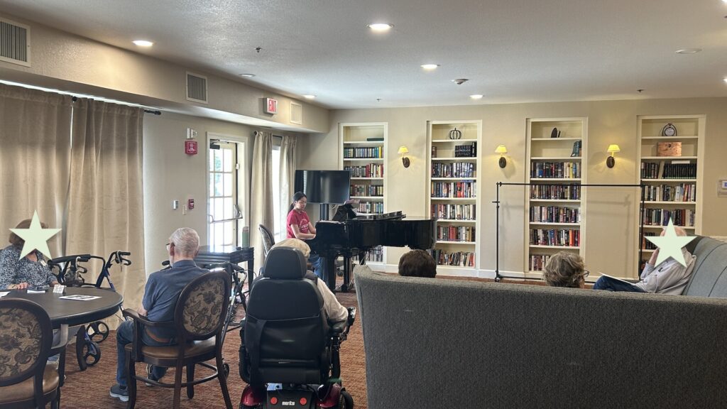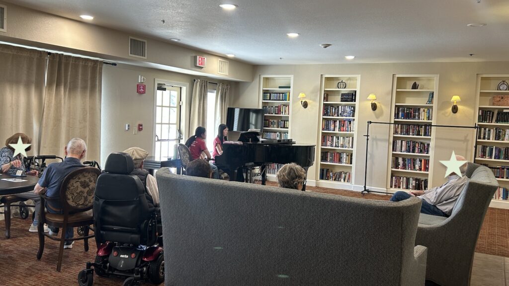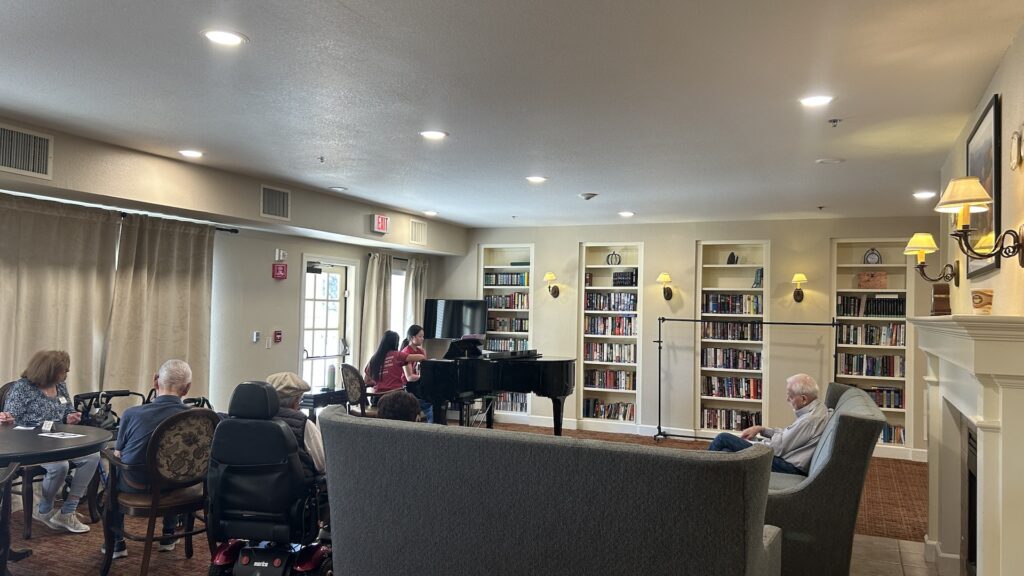 Members signed in at the front before going to the library to set up. They were happy to see some seniors already awaiting them on the couches. Members started by playing some songs that were requested from the week before and then played some light classical music. At the halfway mark, they took song requests from seniors, which included a variety of jazz, movie, and Broadway songs. When leaving, members realized that there were some seniors listening outside of the library on the chairs and they said hello to them. Before leaving, they signed out.