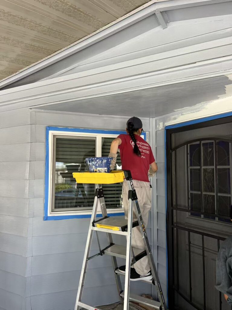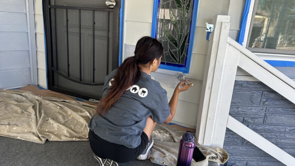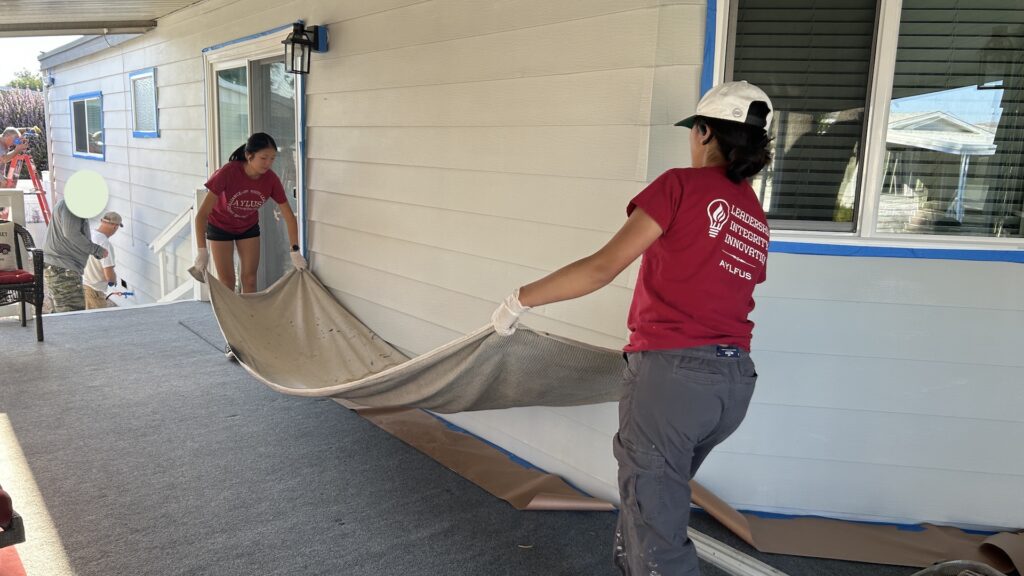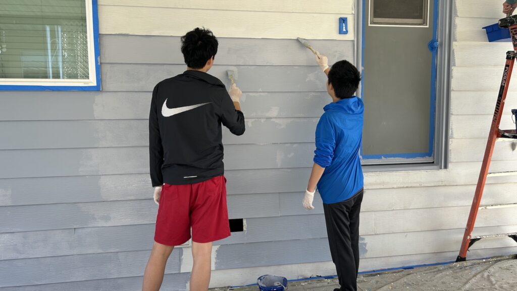 Late August in California can bring extreme heat, but despite the challenging weather, members got out of their cozy beds early on a weekend morning to dedicate their time to serving the community. As usual, members were carefully prepared the work area before the paint. They taped off the window frames, door frames, covered the floors with tarps to prevent any paint stains. After the preparation work, the supervisor of Habitat provided a professional painting demonstration, explaining techniques to avoid “runs”, one of the supervisor also gave important safety instructions, such as how to properly use ladders.