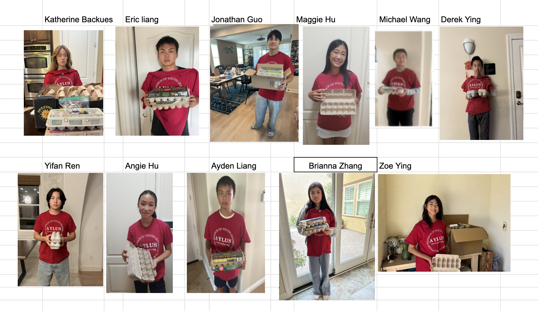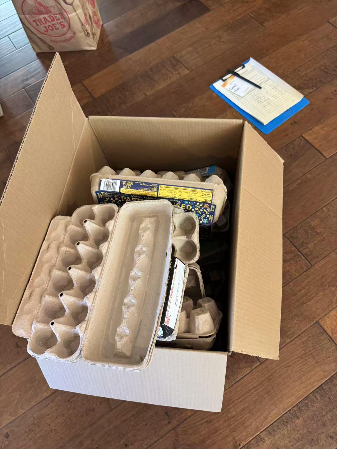 We are helping 92130Cares, a non-profit organization that provides food to poor families in 92130. Grocery stores are not allowed to remove broken eggs from a carton, so they donate the whole package to 92130Cares. 92130Cares repackages the good eggs into packages of 6, and the donated egg carton will be cut and used to help safely distribute eggs in our community, helping families in need.