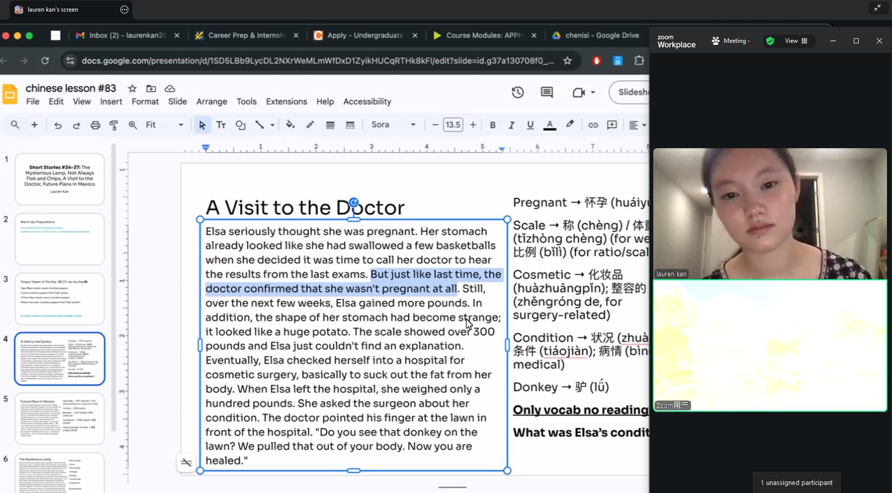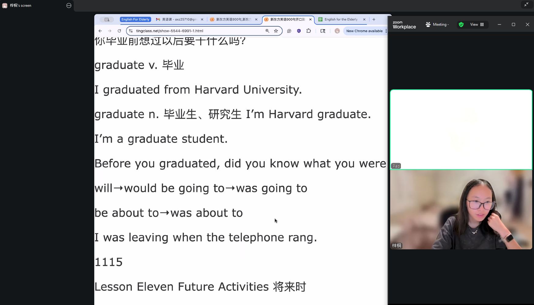 Due to current circumstances, English for the Elderly is hosted online, through Zoom video conferences. First, both the elderly and the volunteers joined the main room for attendance. Then, they were organized into several breakout rooms. Greater volunteer participation has allowed lessons to be split into one-on-one sessions, which are more personal and help to build communication skills for both the volunteer tutors and elderly students.