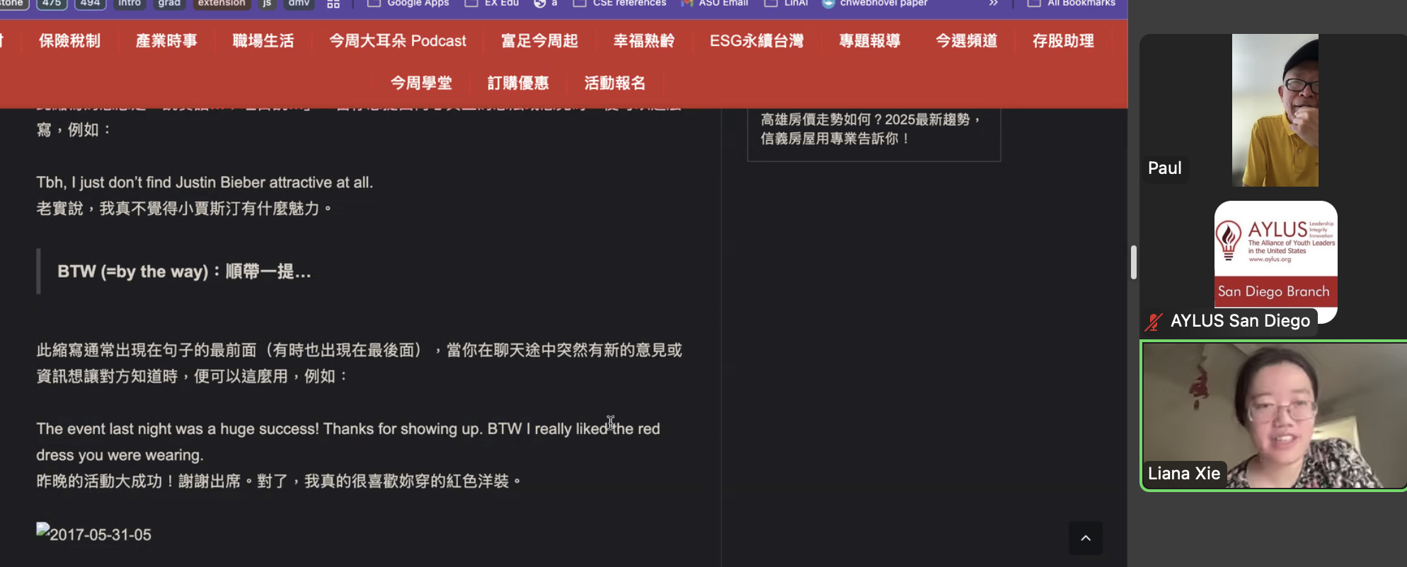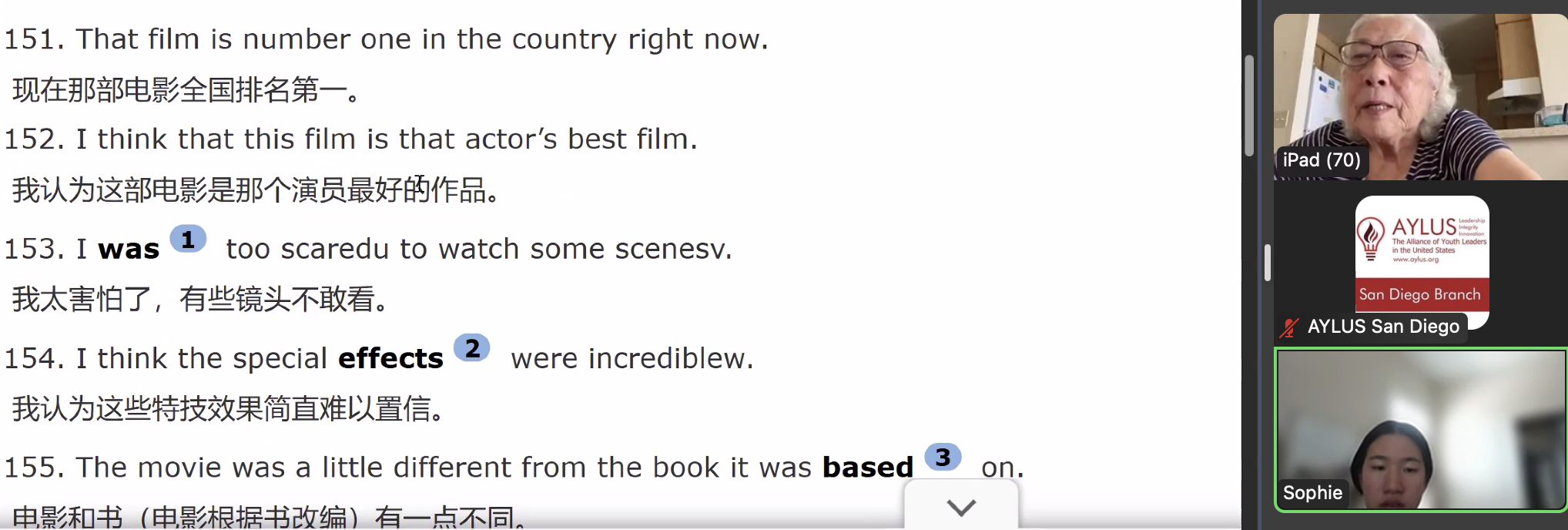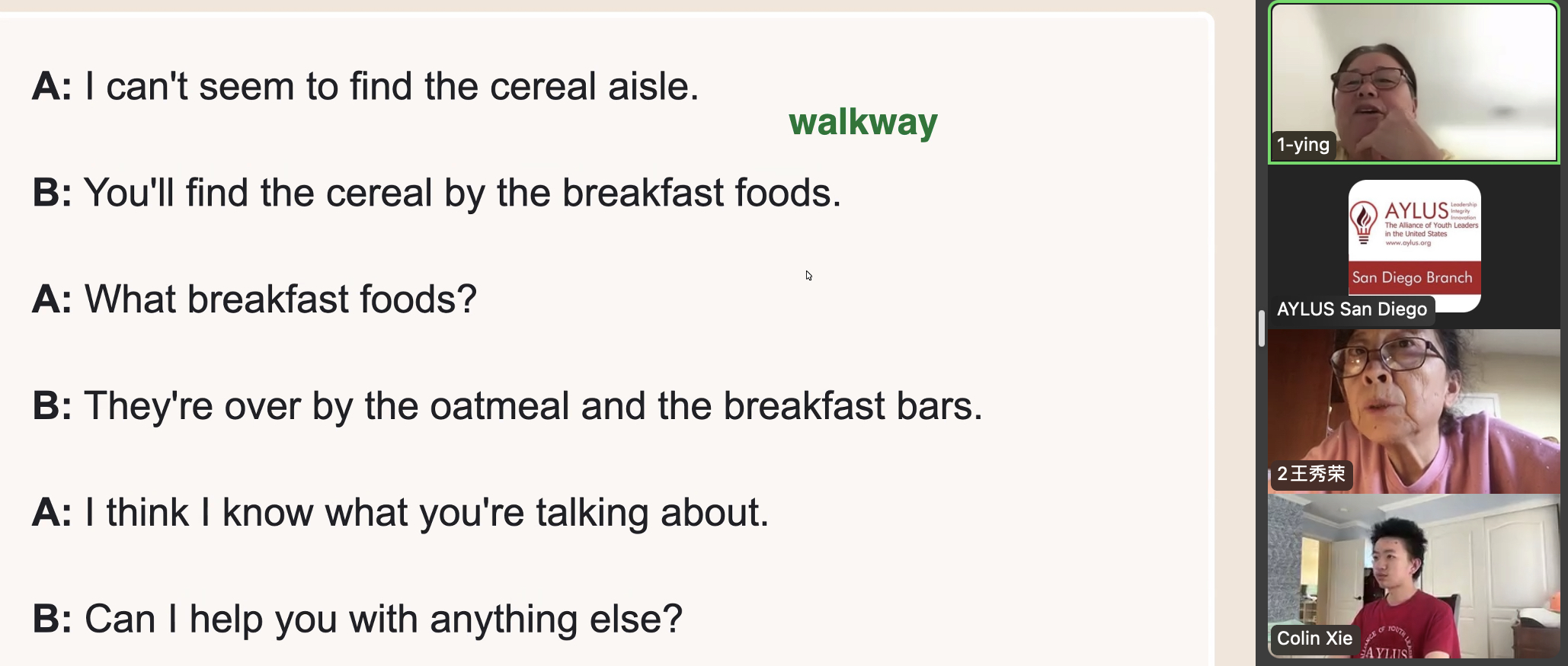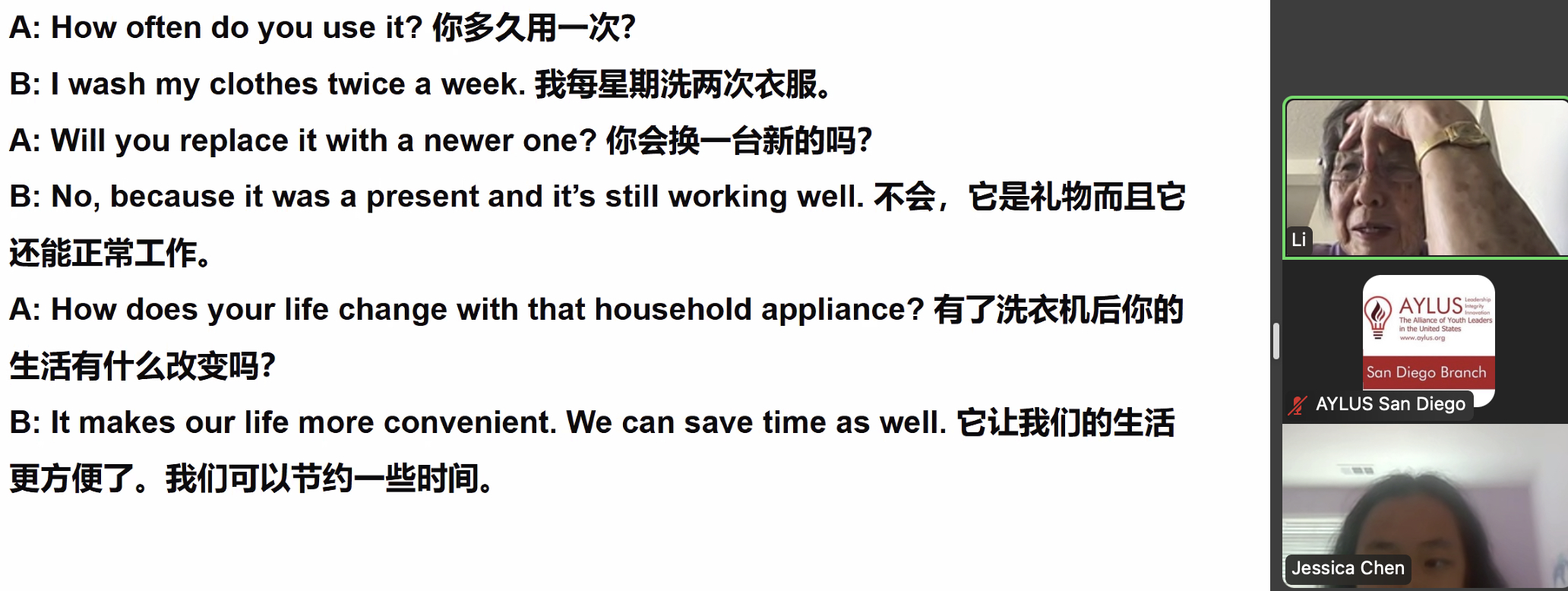 On August 31st, members of the AYLUS San Diego branch participated in the 275th online English for the Elderly activity. The goal of this activity is to help elderly men and women from China learn the basics of English so that they’re able to use them in their daily lives.