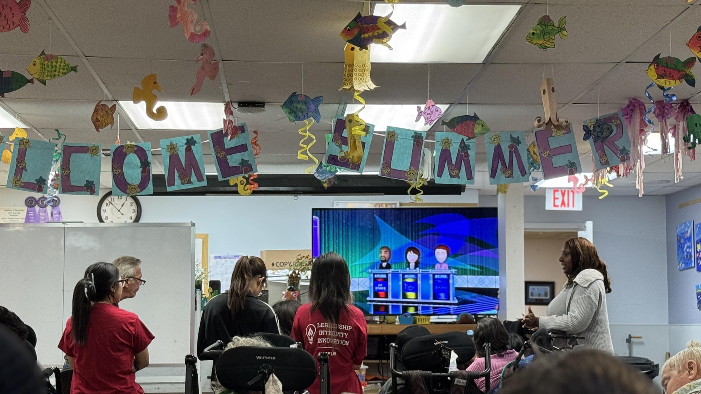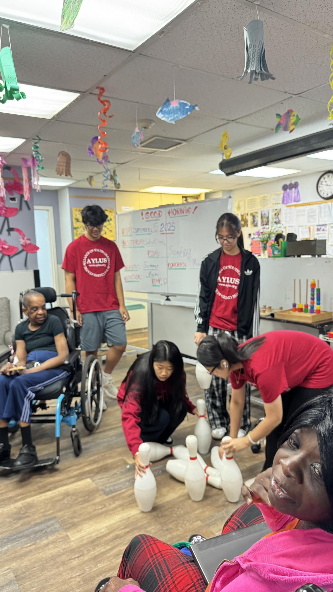 On September 7th, volunteers from the Syosset branch of AYLUS visited CP Nassau’s Bayville location. Volunteers began their visit by playing bowling with the residents, assisting the residents by wheeling them to the lane, helping them roll the ball, and resetting the pins. Some residents needed the volunteers help in order to be able to roll the ball, as they were unable to use the sufficient amount of strength on their own. Afterwards, the volunteers played hangman with the residents having them guess the words “umbrella, sitting on a beach, and AYLUS.” The visit ended with an engaging game of jeopardy on the Mii which all of the residents and volunteers participated in enthusiastically. Both volunteers and residents enjoyed the visit and shared laughs.