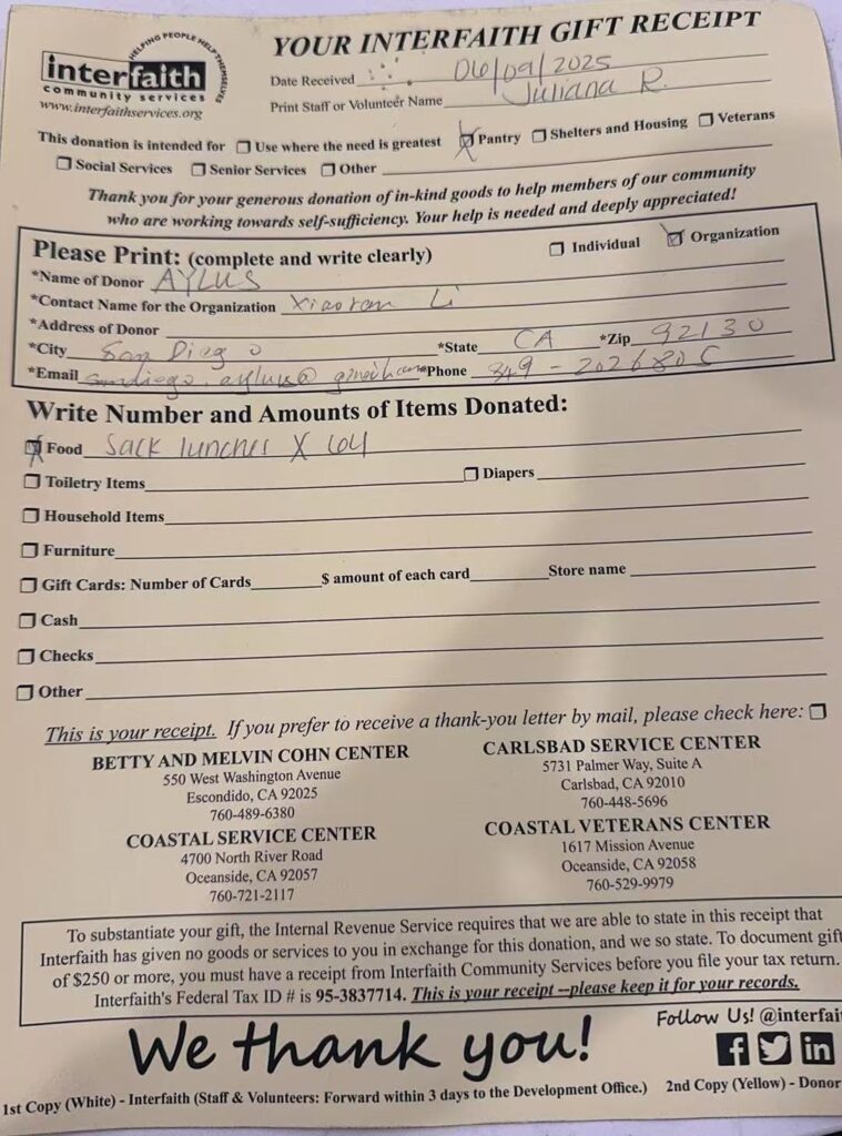On September 2, 2025, AYLUS San Diego Branch made sack lunches for Interfaith Community Services.