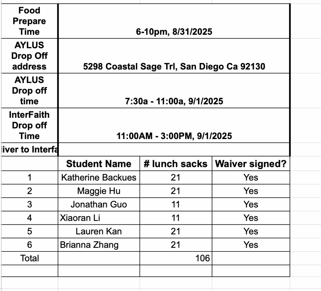 The following 6 AYLUS volunteers participated and made 106 sack lunches 9/2/2025 and delivered all of them to Interfaith Community Services on the day: