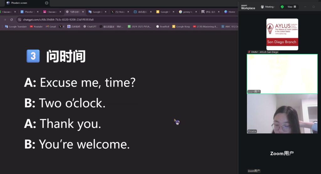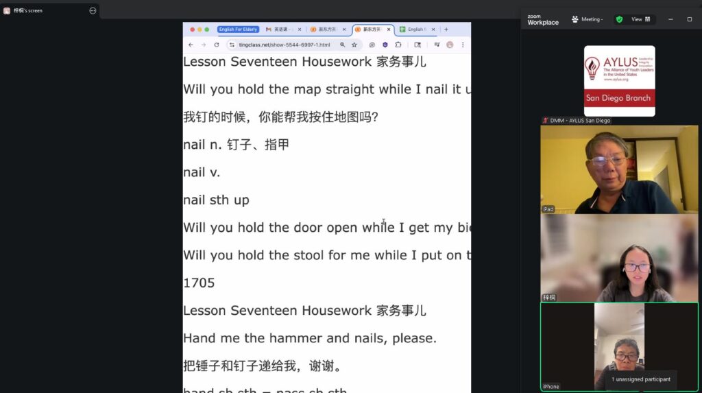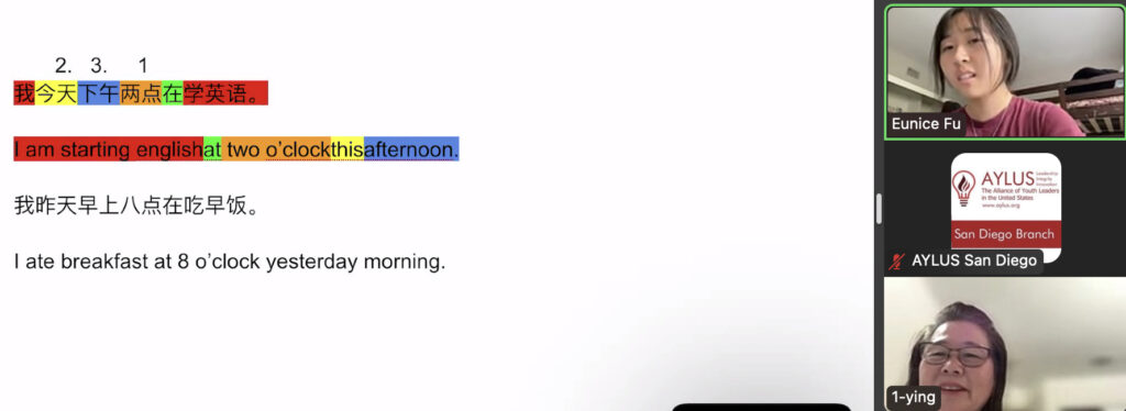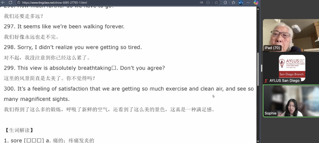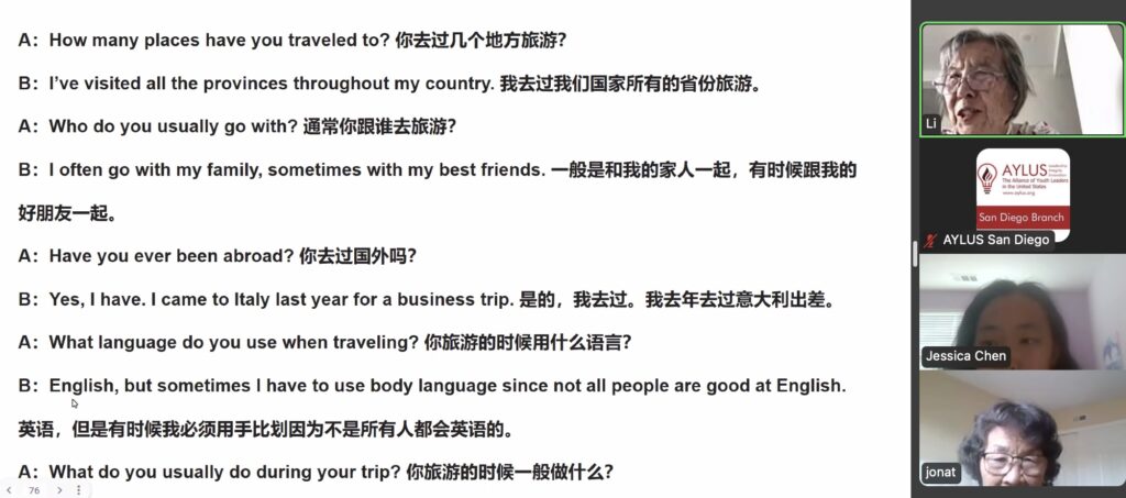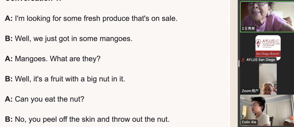 On September 14th, members of the AYLUS San Diego branch participated in the 277th online English for the Elderly activity. The goal of this activity is to help elderly men and women from China learn the basics of English so that they’re able to use them in their daily lives.