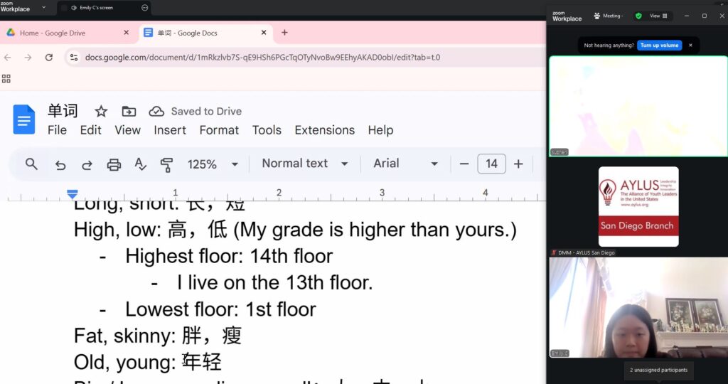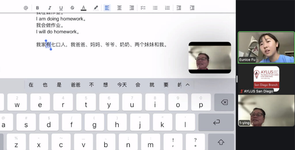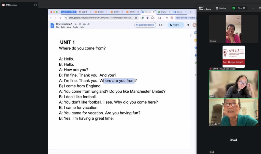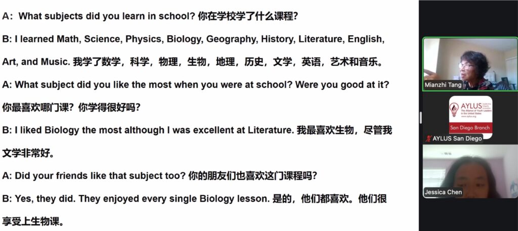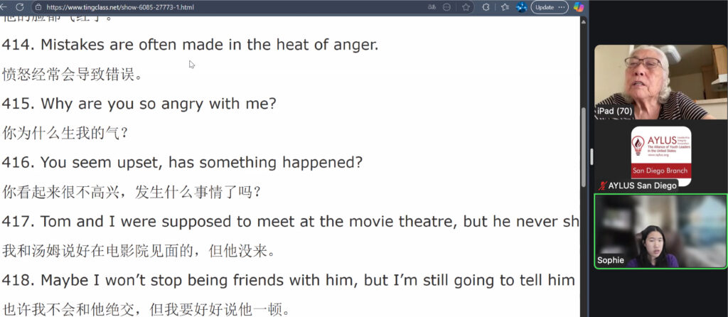 On September 28th, members of the AYLUS San Diego branch participated in the 279th online English for the Elderly activity. The goal of this activity is to help elderly men and women from China learn the basics of English so that they’re able to use them in their daily lives.