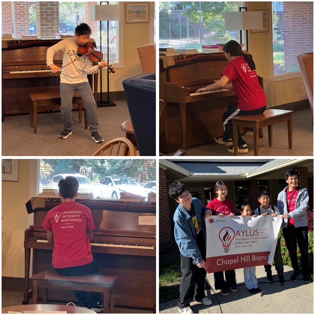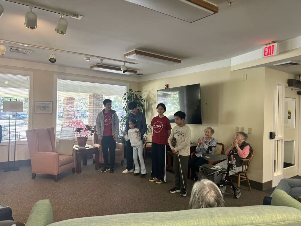 On Sunday, October 19th, 2025, the Carol Woods Retirement Community in Chapel Hill hosted a live music event, featuring volunteers from the Chapel Hill AYLUS branch. The group — consisting of 1 violinist, two pianists and three vocal singers — performed a program of varieties pieces for the residents.