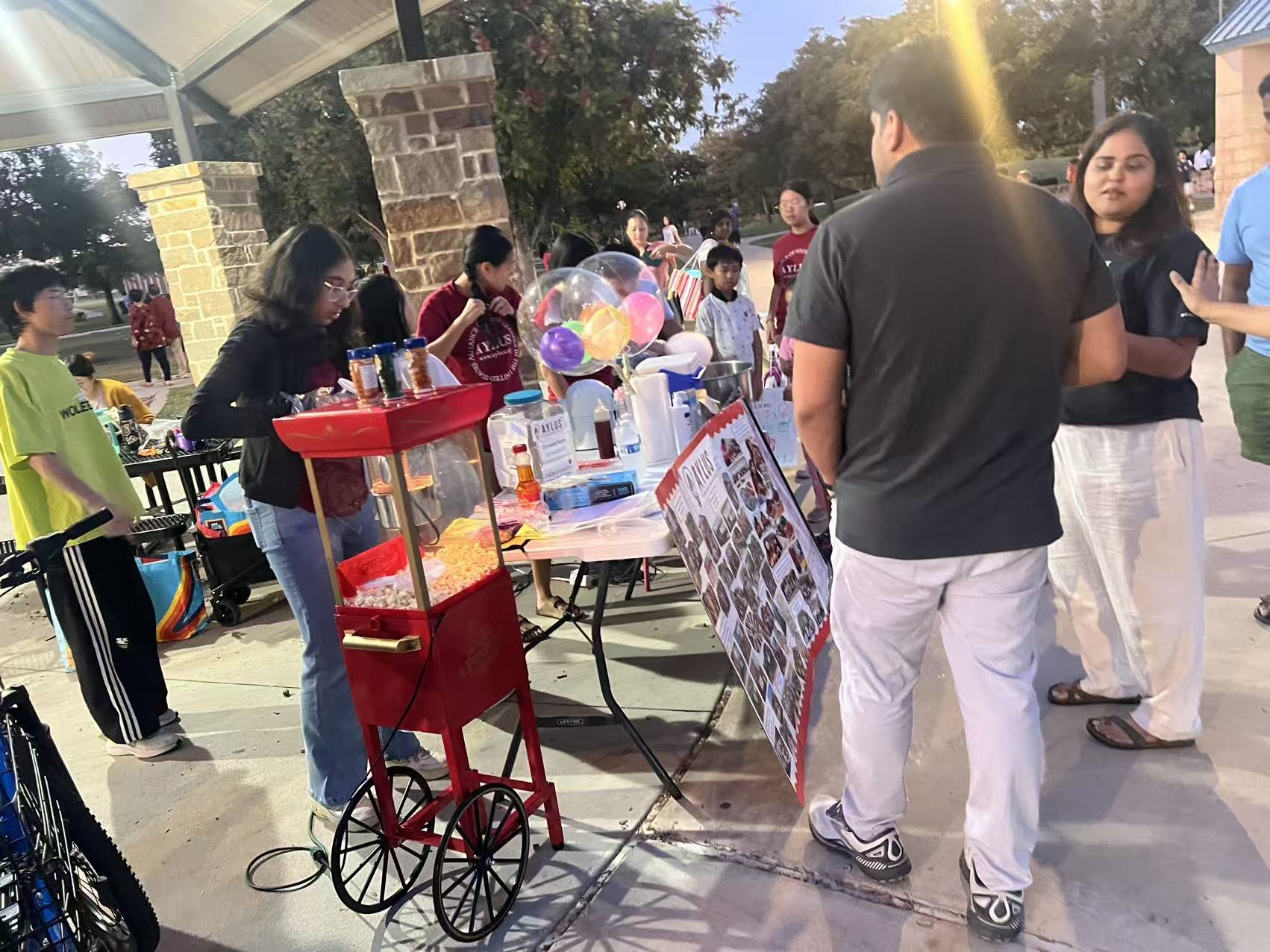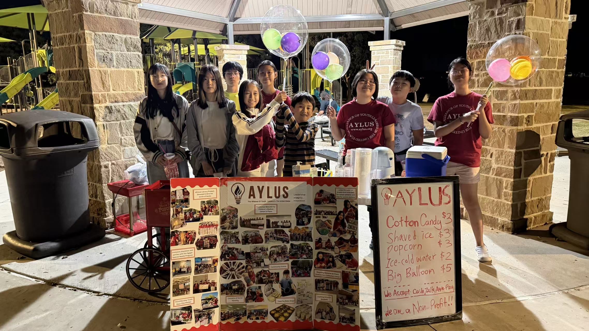 On October 19th, 10 AYLUS volunteers set up their stand at Russell Creek Park. Fundraising for the Plano Children’s Medical Center, the volunteers helped make cotton candy, shaved ice, and popcorn for children and adults alike. Additionally, they sold bottled water and huge fancy balloons. They split the roles of creating which items between themselves, as well as designated who would be the cashier and who would be part of the advertising team. However, after an hour, the volunteers were free to switch roles in case any one needed a break. The event leaders also helped teach volunteers how to do different roles than some were used to – such as create cotton candy or do advertising. Despite the fact that it was Sunday (instead of the usual Saturday), a day before school, and despite the fact it was colder—many people still came to the AYLUS stand! They especially loved the cotton candy, although one kid bought one of the huge fancy balloons. Even just as the volunteer stand was closing, a kid still asked for a shaved ice! All in all, the event was successful. Good work, volunteers!