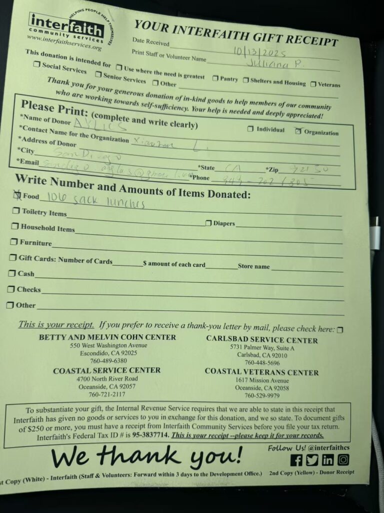 On October 13, 2025, AYLUS San Diego Branch made sack lunches for Interfaith Community Services.