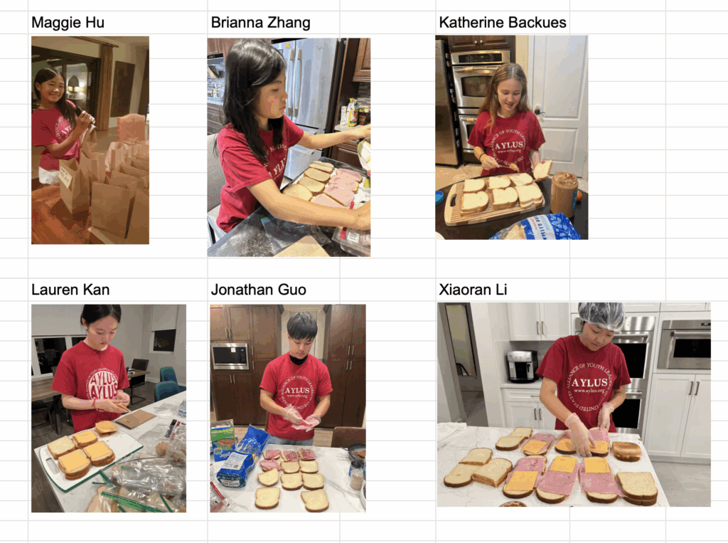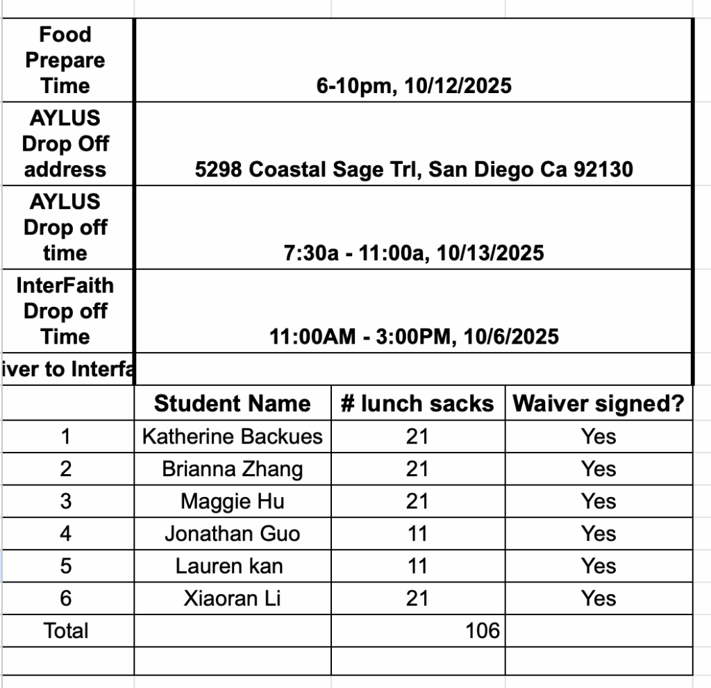 The following 6 AYLUS volunteers participated and made 106 sack lunches 10/13/2025 and delivered all of them to Interfaith Community Services on the day: