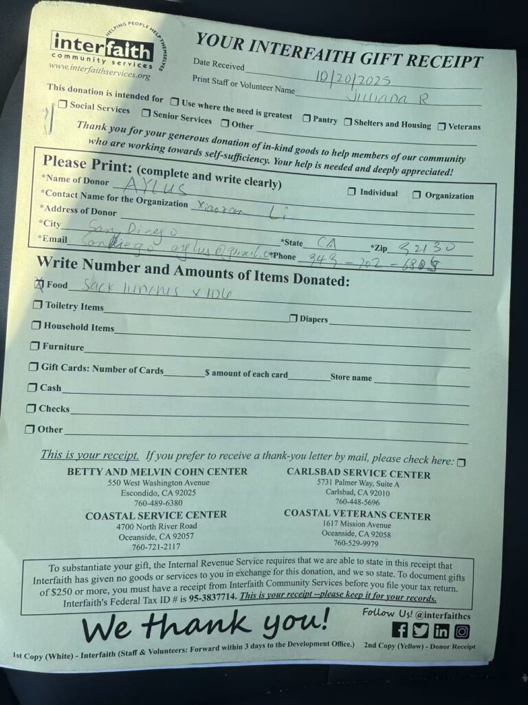 On October 20, 2025, AYLUS San Diego Branch made sack lunches for Interfaith Community Services.