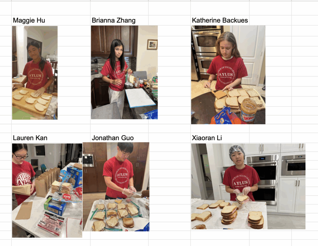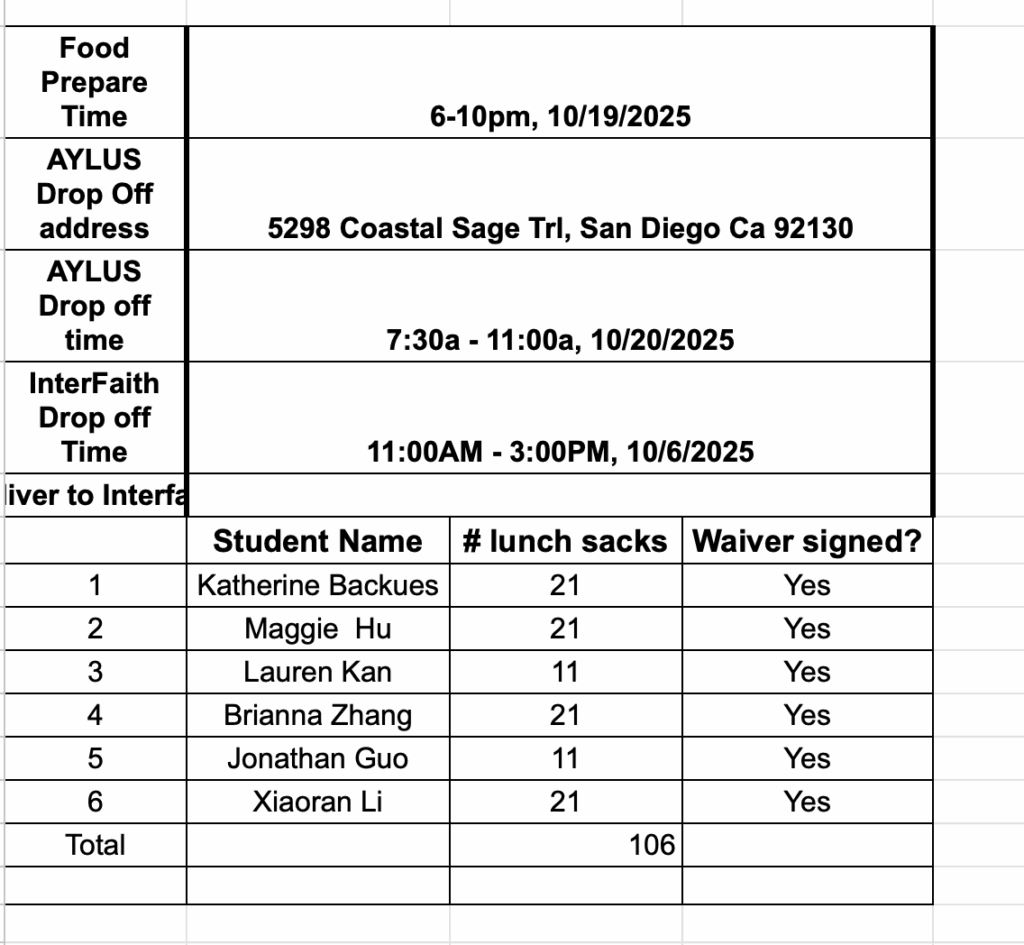 The following 6 AYLUS volunteers participated and made 106 sack lunches 10/13/2025 and delivered all of them to Interfaith Community Services on the day: