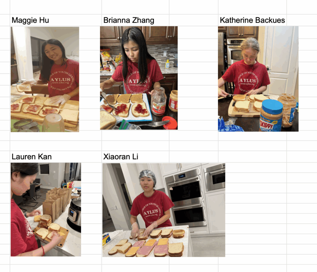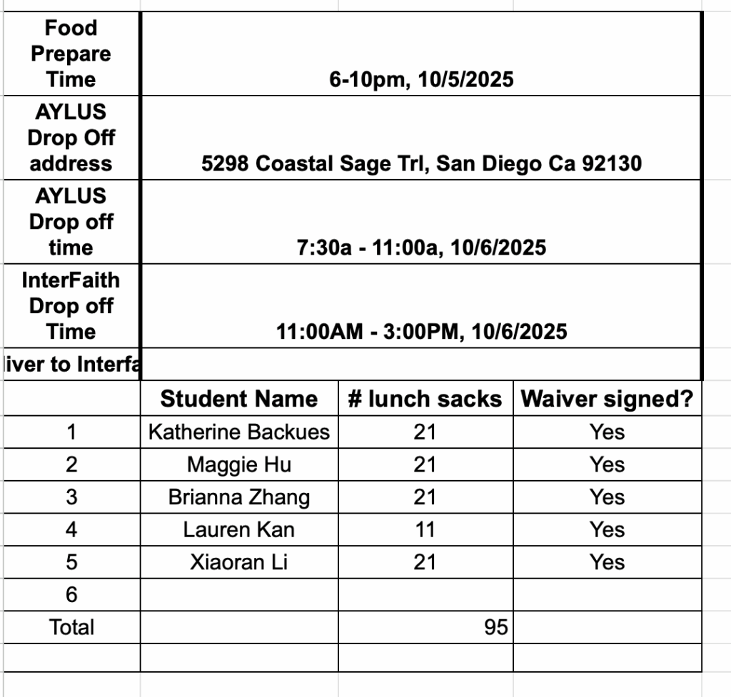 The following 5 AYLUS volunteers participated and made 95 sack lunches 10/6/2025 and delivered all of them to Interfaith Community Services on the day: