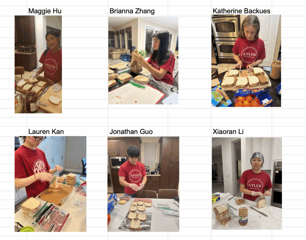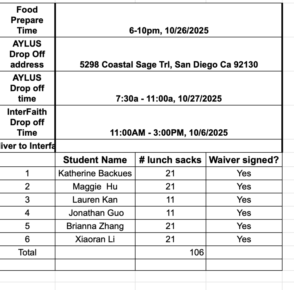 The following 6 AYLUS volunteers participated and made 106 sack lunches 10/27/2025 and delivered all of them to Interfaith Community Services on the day: