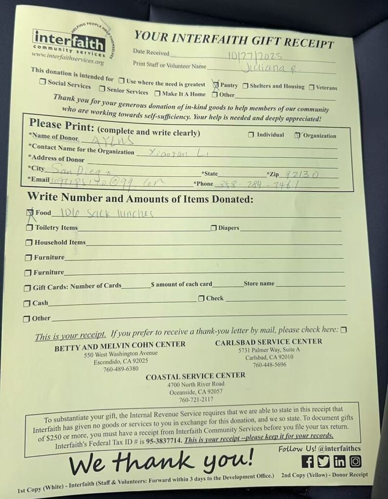 On October 27, 2025, AYLUS San Diego Branch made sack lunches for Interfaith Community Services.