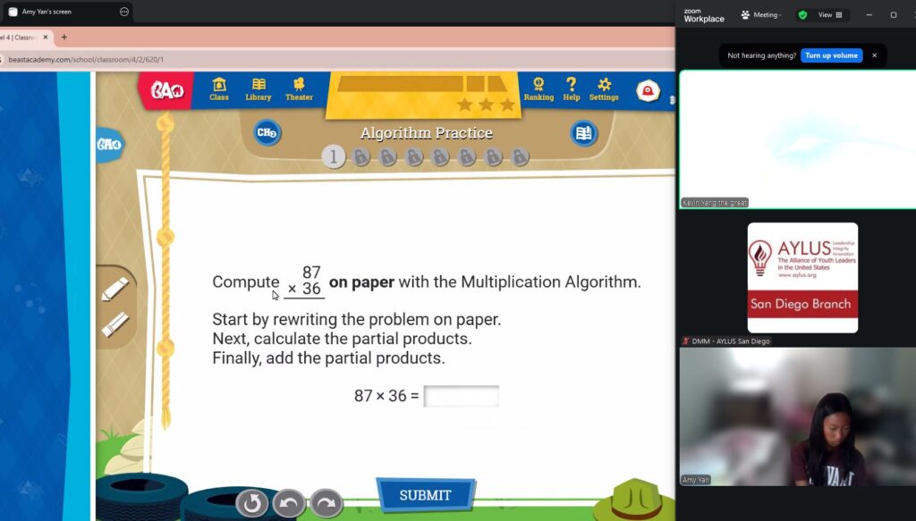 Beast Academy is a mathematics program for elementary and middle school students, and highly qualified high school volunteers will be teaching the Beast Academy curriculum. Currently at the San Diego Branch, enough students have signed up for this course for it to be offered in five levels: 1, 2, 3, 4 and 5. Through tutoring sessions hosted virtually over Zoom, our volunteers teach students numerous informative mathematical concepts that help to bolster problem-solving skills and improve their mathematical knowledge.