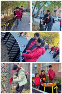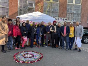 After we were finished Maureen gathered us around for the Diwali celebration. At the celebration, there were members of the Sikh Center of New York and the Hindu Center. Before the celebration Maureen had us help set up ribbons on the fences around the area. She also had us help display the food and snacks. After that she explained to us what Diwali is. Diwali is an Indian holiday celebrating light. After that, a musician on the Dhol, a type of double headed drum, started playing music for the start of the celebration. During the celebration Maureen and members of the Sikh and Hindu centers handed out delicious, traditional Indian food; soft drinks and Halloween candies.