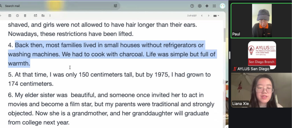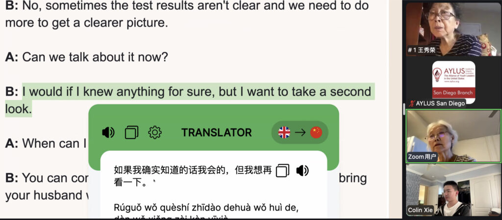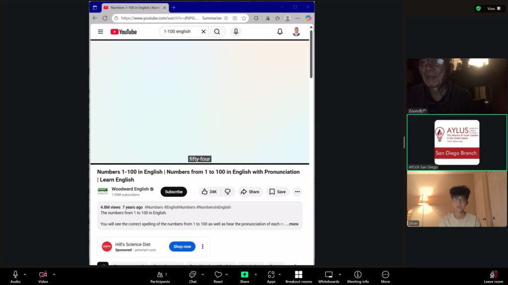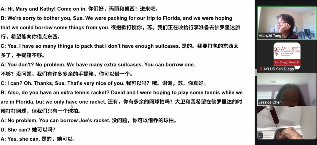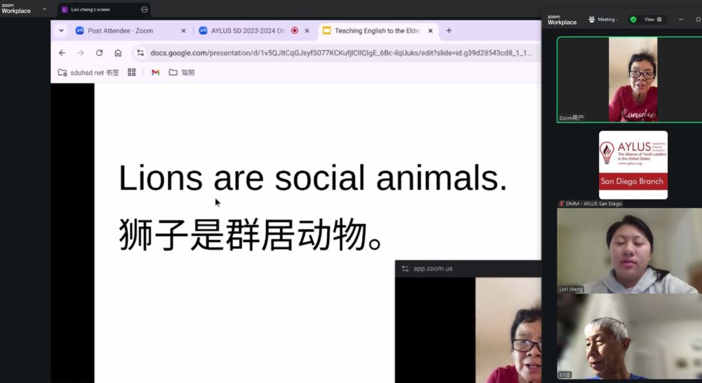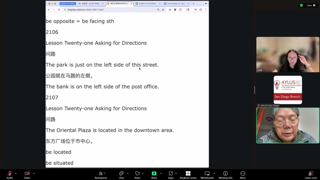 On October 25th and 26th, members of the AYLUS San Diego branch participated in the 283rd online English for the Elderly activity. The goal of this activity is to help elderly men and women from China learn the basics of English so that they’re able to use them in their daily lives.