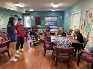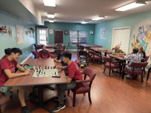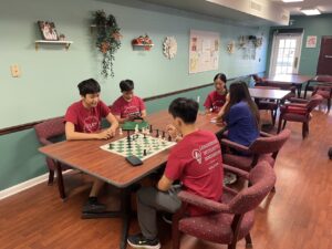 On September 27, 2025, from 2:30 PM to 3:30 PM, AYLUS Greater Memphis members Alex Shi, Evan Shi, Irvin Ju, Charlotte Cheng, and Yifei Ren volunteered at the Plantation Senior Care Center. They enjoyed playing chess, including bughouse, and Scrabble with the residents, providing mental stimulation and fun.
