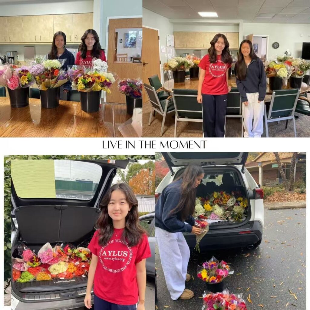 On Sunday, November 9th, 2025, two members of AYLUS Chapel Hill Branch helped support Charles House by collecting flowers generously donated by Trader Joe’s. These beautiful blooms were delivered to Charles House, a nonprofit that provides care for seniors and those with dementia within the Carol Woods Retirement Community. The flowers will be used in a creative art project with the seniors on Monday, brightening their day and encouraging creativity. This effort is part of our ongoing commitment to supporting the health and happiness of the elderly, and we look forward to more opportunities to give back.