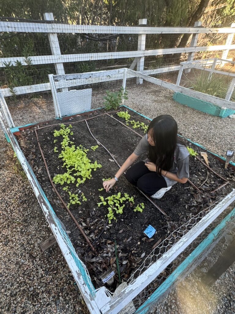 When we went to the vegetable garden today, we found that the lettuce in the third section, which we planted last week, hadn’t sprouted yet, but the lettuce in the first and second sections, which we planted earlier, were already growing lush green leaves. We weeded and fertilized as usual, hoping they would grow well.