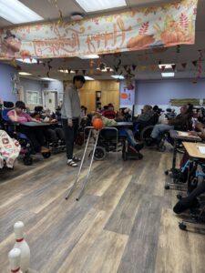 We began the day out by saying hello to all the residents since it has been a while since we have seen them. Every single day the residents will sing the good morning song and today we were just on time for it. We sang the good morning song and everyone sang their hearts out! Our next activity of the day was bowling. The residents love this game so much and every time we visit it has become a mandatory game to play. Each resident went 2-3 times and we helped guide some of them with our hands and together we took down the pins. After we finished bowling we decided to do some axe throwing. Last year around Christmas time, our organization gifted an axe throwing toy to the residents and since then they have used it so many times. One volunteer would hold up the target while another would help guide the residents hand towards the bullseye. Each resident’s aim was on point today and many of them hit the center!