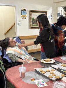 When we first arrived, we greeted the staff and the five residents who had joined us. We started off by baking chocolate chip cookies. First, we preheated the oven, and then we started making the cookies. The recipe called for cookie mix, butter, and one egg. After we added all the ingredients into a bowl, two of the residents helped us mix the batter together. It was hard to combine everything into a dough because the butter could not be melted, only softened, but one of the residents did a great job mashing the butter and kneading the ingredients together. We then formed around 24 balls out of the dough, with help from that resident, and placed them onto two pans to go into the oven for 12-14 minutes.