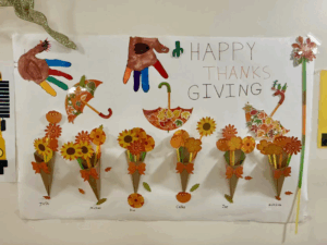 After the game, we worked together on a large Thanksgiving poster, guiding the residents’ hands, helping them place decorations, and allowing them to participate at their own pace.