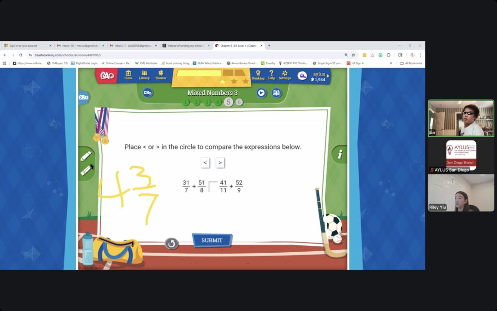 Beast Academy is a mathematics program for elementary and middle school students, and highly qualified high school volunteers will be teaching the Beast Academy curriculum. Currently at the San Diego Branch, enough students have signed up for this course for it to be offered in five levels: 1, 2, 3, 4 and 5. Through tutoring sessions hosted virtually over Zoom, our volunteers teach students numerous informative mathematical concepts that help to bolster problem-solving skills and improve their mathematical knowledge.