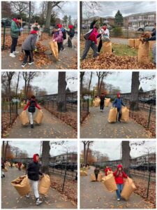 The mulch was in piles already by the time we got there, thanks to Roxana and the park rangers. The members went to receive tools such as shovels and rakes from the truck. Groups of boys were assigned to shovel mulch into wheelbarrows and trash bags to move and spread the mulch into the garden beds. The other members were assigned to rake fallen leaves and put them into recyclable bags. Once the groups assigned to mulching were done, they helped to finish raking the leaves.