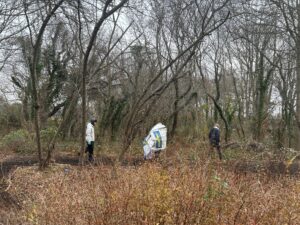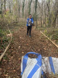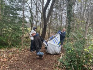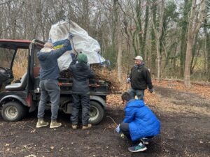 On December 6th, from 9:00 to 11:00 AM, the AYLUS Dix Hills Branch volunteered in the back of the Northside Elementary School in Bethpage State Park. Using several tools such as fan rakes, iron rakes, and loppers, the AYLUS volunteers assisted in various activities like cleaning up long pathways of English ivy, removing their roots with rakes and loppers to prevent their return, and taking out different vines and bramble choking trees. Volunteers first piled any debris collected before filling large canvas bags to move it to a cart for disposal, after which they raked the path again to pick up any loose left over pieces and slightly smooth the dirt. Volunteers also dug out many small stumps that could pose as tripping hazards from the path so that any visitors wouldn’t have to be overly concerned about watching their step.