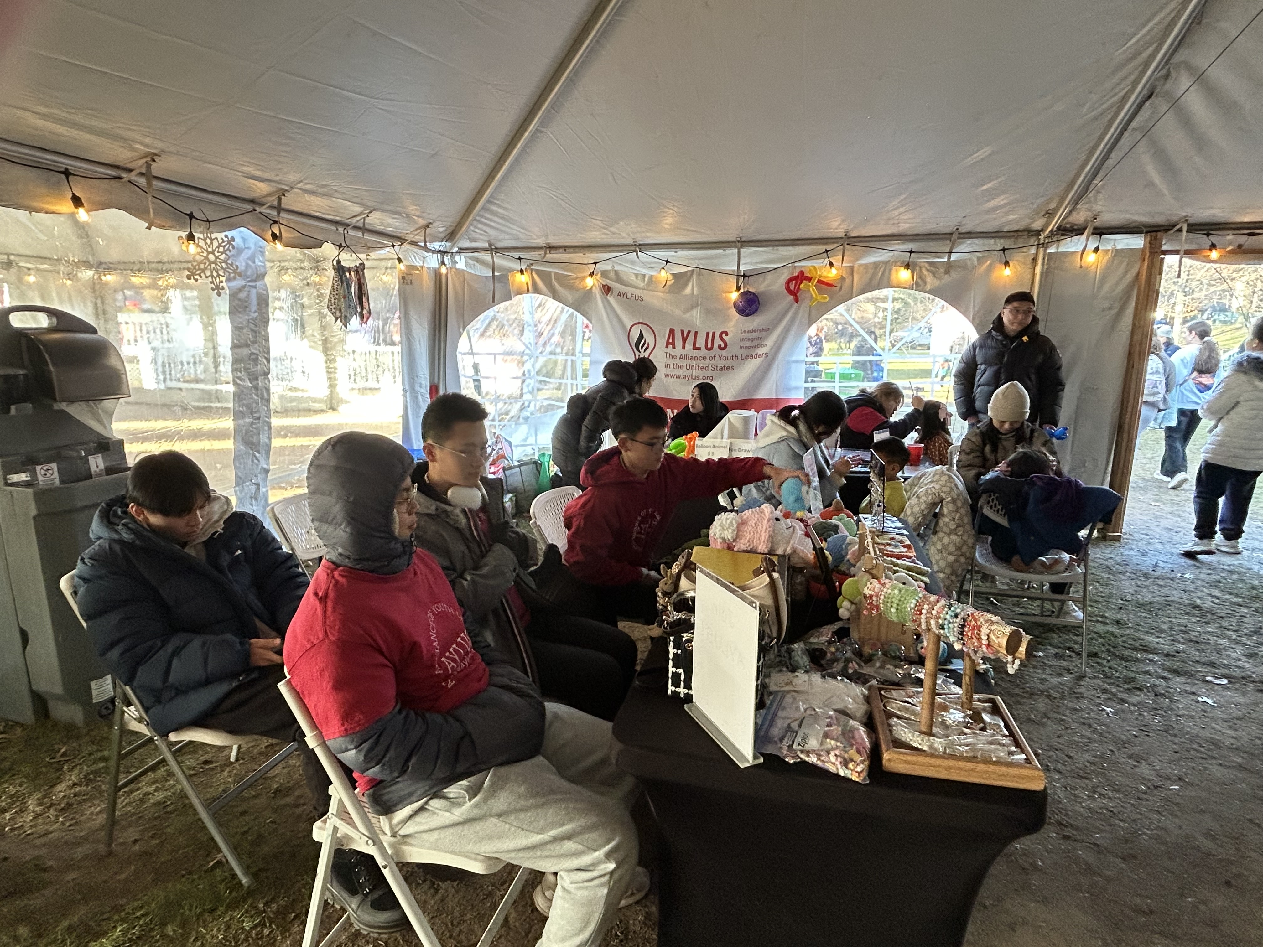 On December 6th, 2025, AYLUS Great Neck Branch attended the Lights and Ice annual event at the Great Neck Firefighter Park. The Lights and Ice event is said to bring families together, involving a farmers market, bouncy castles, music and much more! Members of AYLUS sold assortments of crocheted goods like cute plushies and handy pockets to store keys/cell phones, bracelets, earrings and other items. Talented AYLUS volunteers also crafted balloon animals and painted on children’s faces per their requests. All the profits from the farmers market go to a nonprofit organization set on improving education for the disadvantaged students. Others wore costumes of beloved cartoon characters like Olaf, Gingerbread man to entertain the children that came to the event. Giving the families visiting a great time. Lastly, other members assisted with the attractions like bouncy castles and riding on a moose! Maintaining lines for the attractions and keeping the safety regulations in check, so they won’t hurt themselves. Some even helped with putting the children onto the rides so they can have a good time too. Overall it was a successful day as AYLUS raised money for a great cause but also warmed the hearts of many children’s.