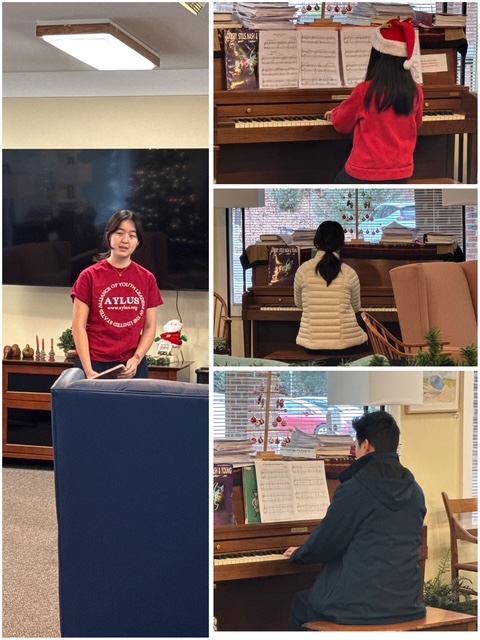 On Sunday, December 21th, 2025, the Carol Woods Retirement Community in Chapel Hill hosted a live music event, featuring volunteers from the Chapel Hill AYLUS branch. The group — consisting of three pianists — performed a program of varieties pieces for the residents.