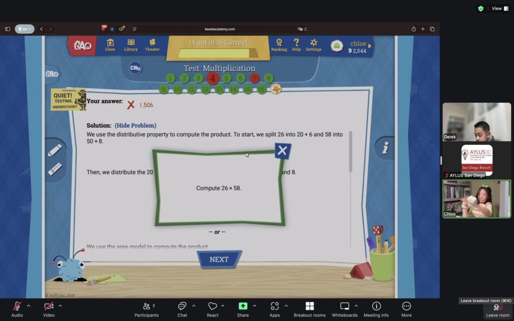 AYLUS San Diego Committee kicked off the Beast Academy online class in 2020 during the COVID-19 period. During 2025-2026, we continue cooperating with Libraries of Love to raise funds. The 69th Beast Academy online class in 2025-2026 was on December 15-December 21, 2025.