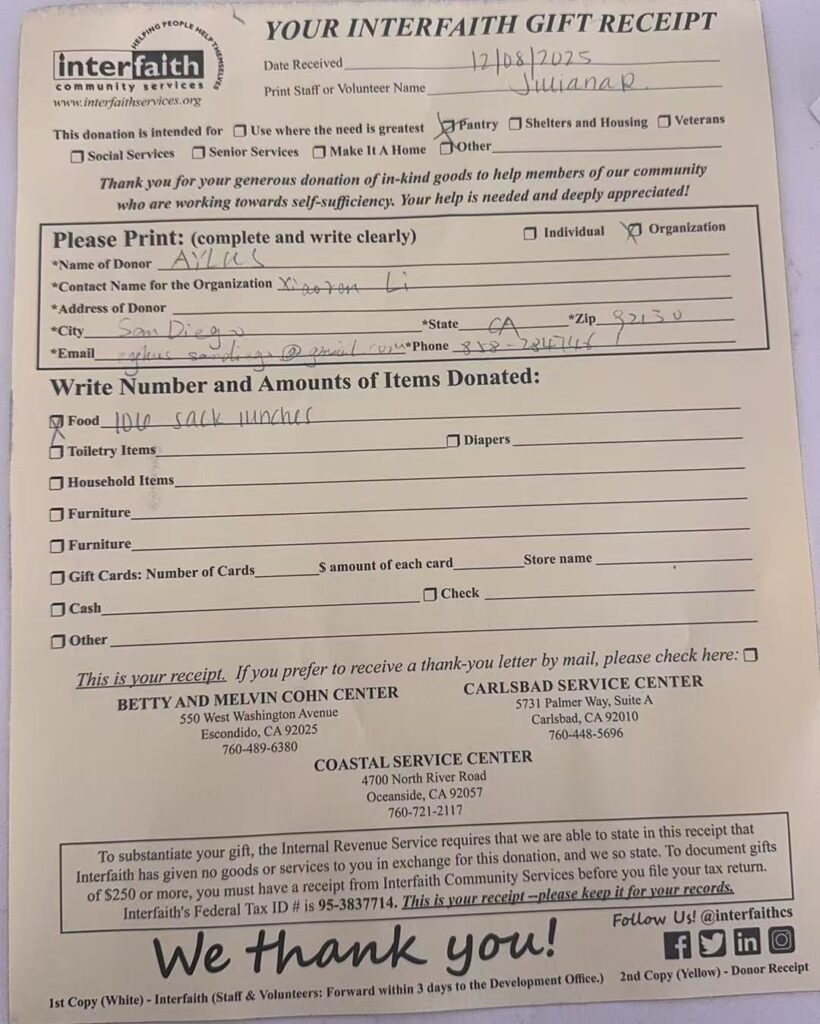 On December 8, 2025, AYLUS San Diego Branch made sack lunches for Interfaith Community Services.