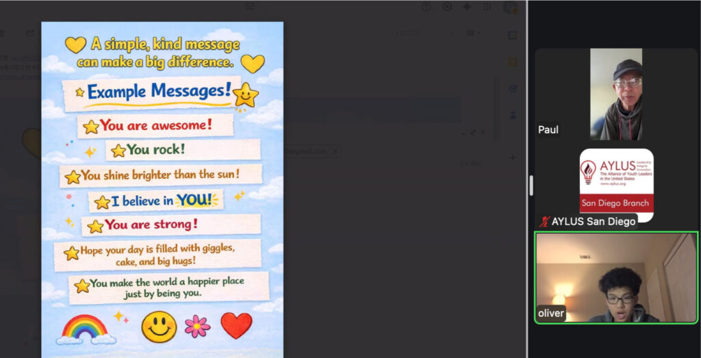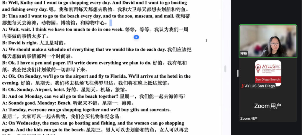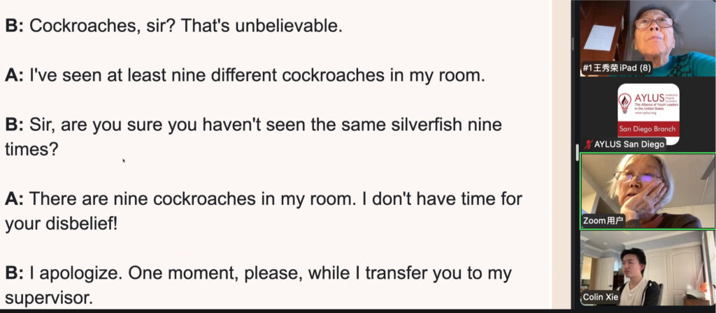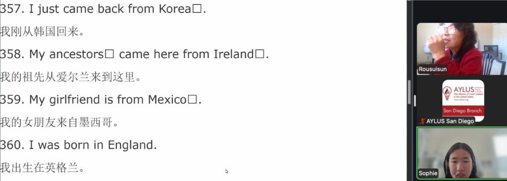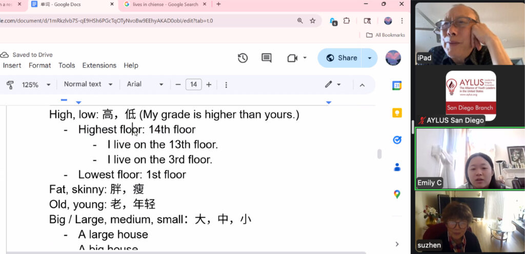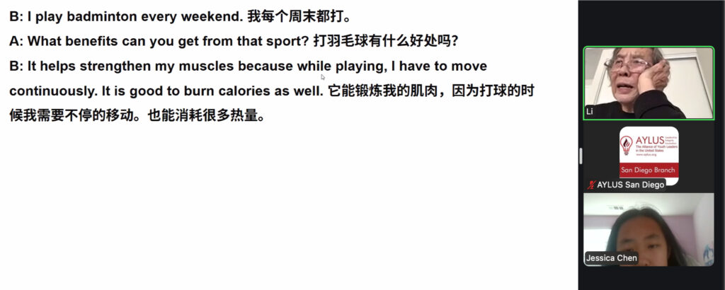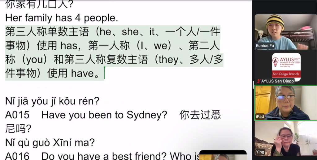 On January 18th, members of the AYLUS San Diego branch participated in the 292nd online English for the Elderly activity. The goal of this activity is to help elderly men and women from China learn the basics of English so that they’re able to use them in their daily lives.