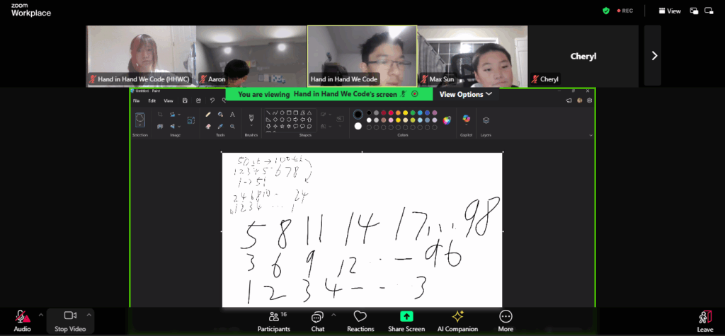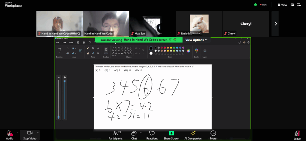 day 1: On the 10th of January 2026, AYLUS’ Hand in Hand We Code (HHWC) project hosted its first AMC 8 Prep camp, with project lead Joey and TA Elissa. They did a walkthrough of basic AMC 8 practice problems, covering a variety of topics such as measures of central tendency (mean, median, mode), simple algebra, mathematical reasoning, fractions, max/min, and number sequences. The regular session was 1.5 hours long, and gave the students good insight into foundational mathematics. Jiayi also spent additional time on Q&A and homework correction.