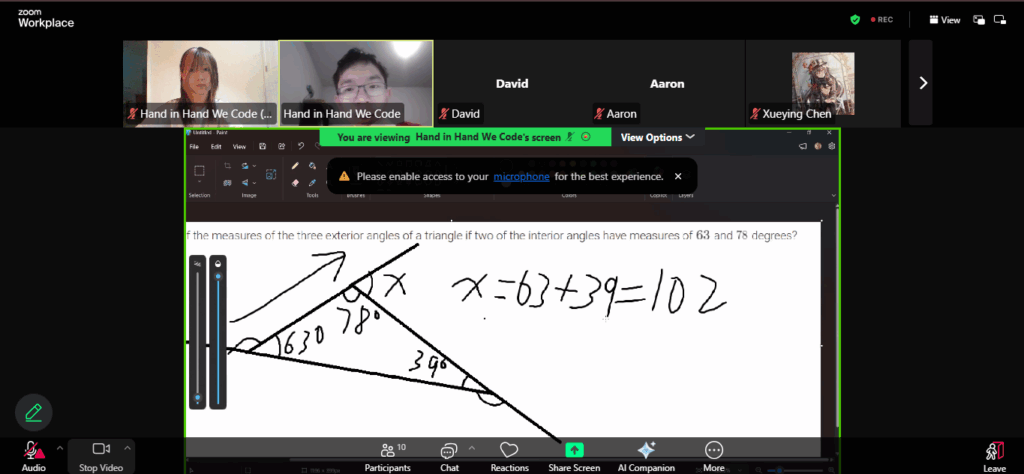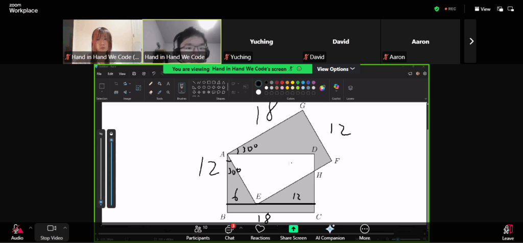 Day 3: On the 17th of January 2026, AYLUS’s Hand in Hand We Code project hosted its third AMC 8 Prep camp, with project lead Joey and TA Elissa. They did a walkthrough of some more basic AMC 8 practice problems, covering a variety of topics such as measures of central tendency (mean, median, mode), simple geometry (angles, shapes, area, perimeter), sequences, and some simple algebra. The class was 1.5 hours long, and gave the students good insight into geometry and algebraic topics. Jiayi also spent additional time on Q&A and homework correction.