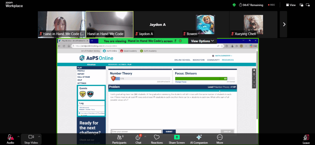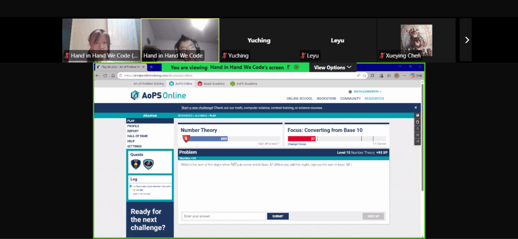 day 5:  On the 24th of January 2026, AYLUS’s Hand in Hand We Code project hosted its fifth AMC 8 Prep camp, with project lead Joey and TA Elissa. They did a walkthrough of some AMC 8 practice problems, focusing on topics like bases (converting to/from), factors/divisors, and reasoning. The class was 1.5 hours long, and gave the students good insight into number theory. Jiayi also spent additional time on Q&A and homework correction.