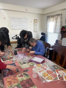 Once the cookies were finished, we set them on the countertop as we began our first activity: jigsaw puzzles. Each resident was assigned a member to assist them in the activity. One of the residents was so happy when the puzzle was finished that she took a picture of the finished piece. When the cookies were done cooling, we helped ourselves to some and shared them with the residents.